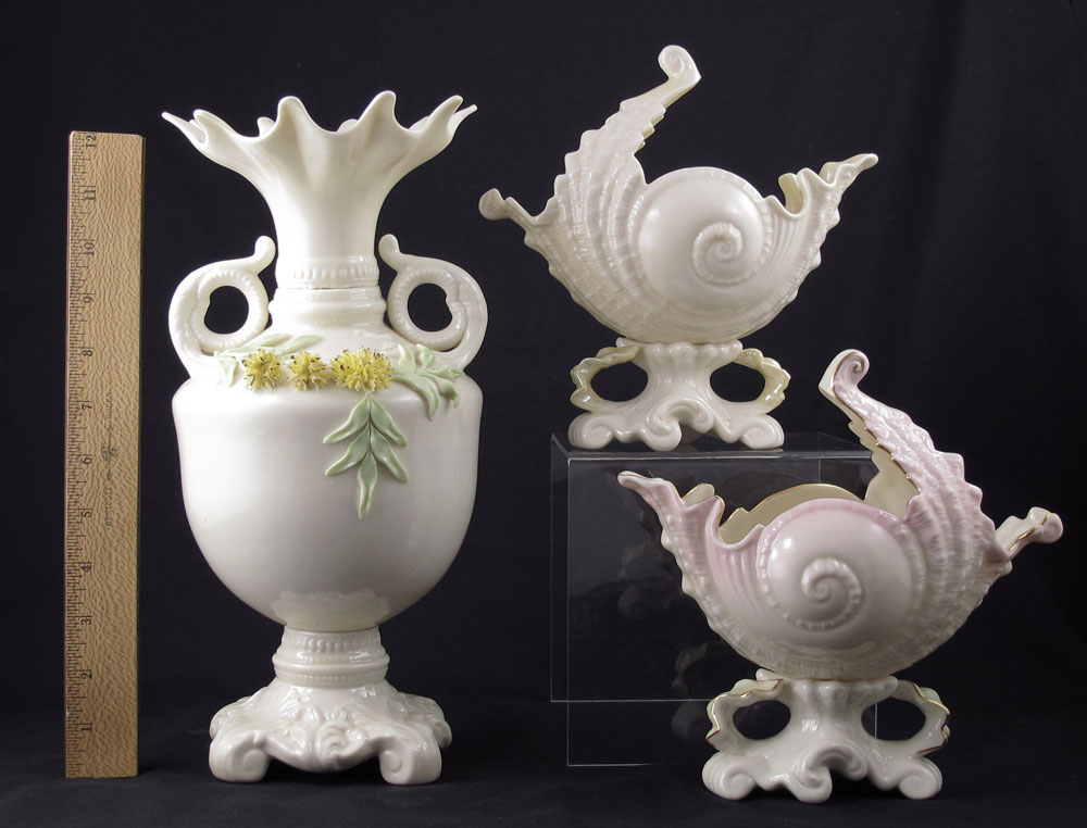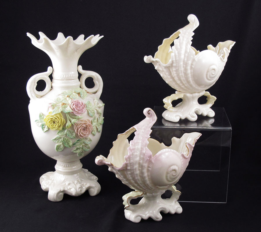 3 PIECE IRISH BELLEEK PORCELAIN: To include 1) Vase with scroll handles and applied flowers. Green mark. 12 3/4'' x 6''. 2) 2 Victoria shell, one with pink highlights and gilt decoration, both with green mark. 8 1/4'' h. x 8'' x 4 1/2''.