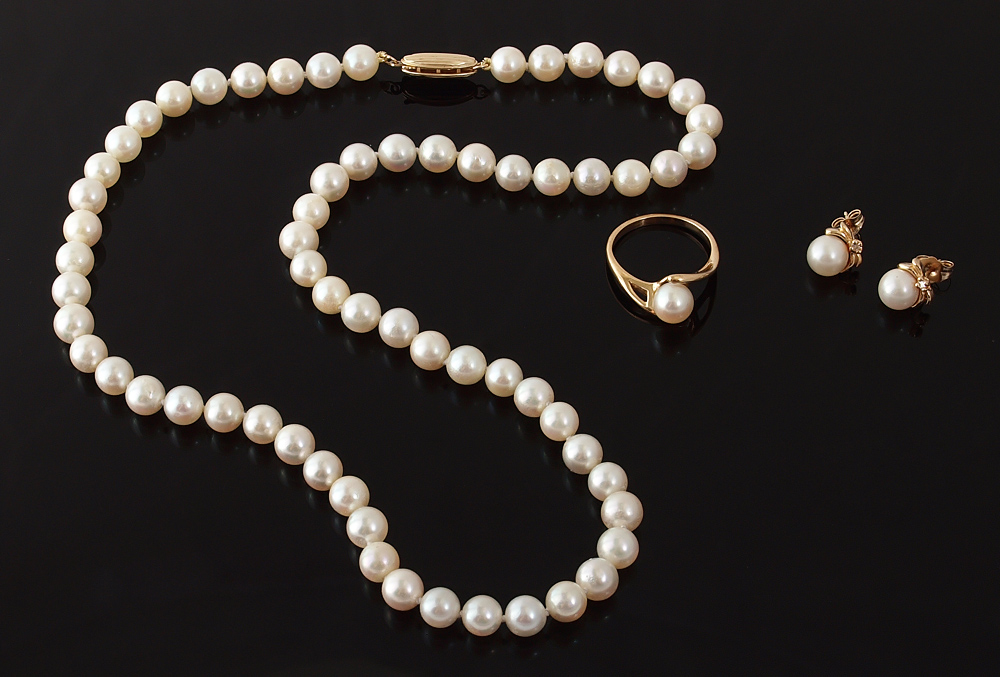 CULTURED PEARL JEWELRY - NECKLACE, RING AND EARRINGS: A 19'' strand necklace, newly restrung and double knotted, 14k gold clasp. Pearl solitaire ring set in a bypass setting of 14k yellow gold, size 6. Pair of pearl and diamond stud post earrings. Gold weight approx. 4 grams. Pearls average 6 mm.