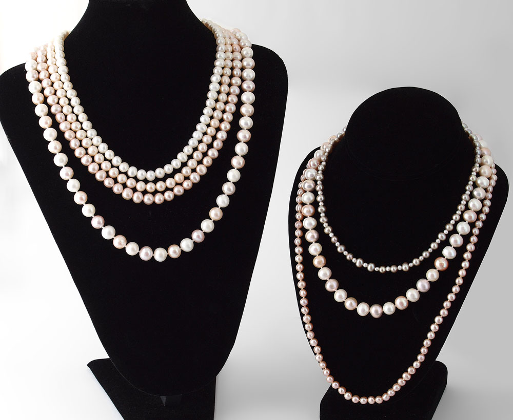 5 PINK FRESH WATER CULTURED PEARL NECKLACES: The longest being 21''. Size of pearls range from 3-10 mm. 14K gold and sterling clasps.