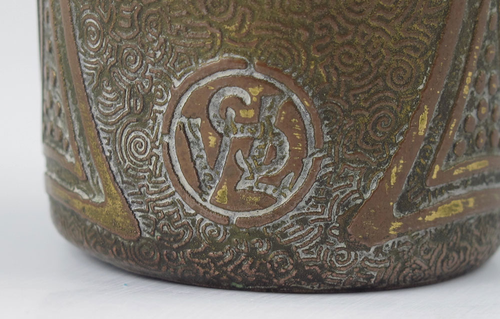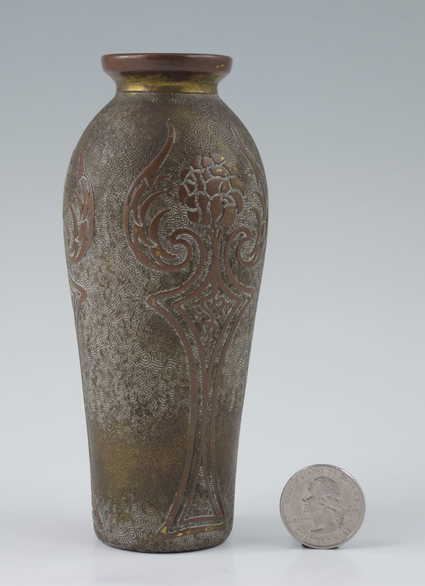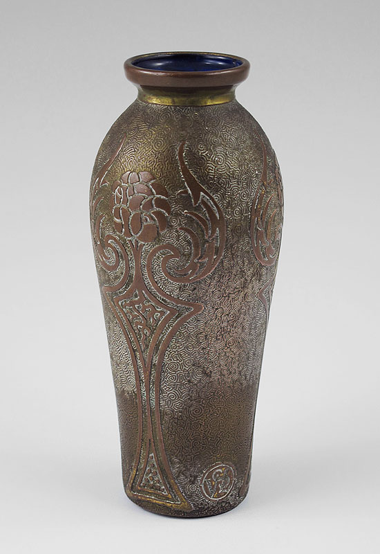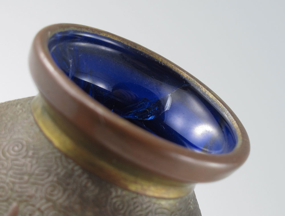 VAL ST LAMBERT COPPER OVERLAY VASE: Cobalt glass clad in embossed copper. 5 1/2'' tall. VSL logo. Unfortunate crack in glass.