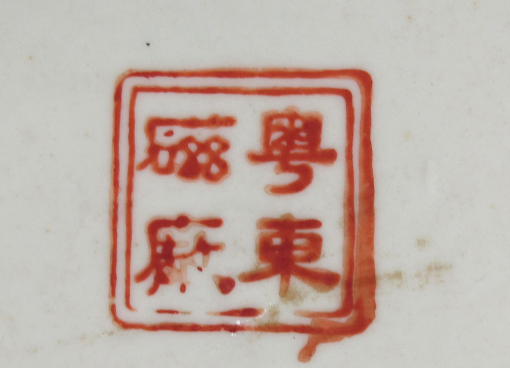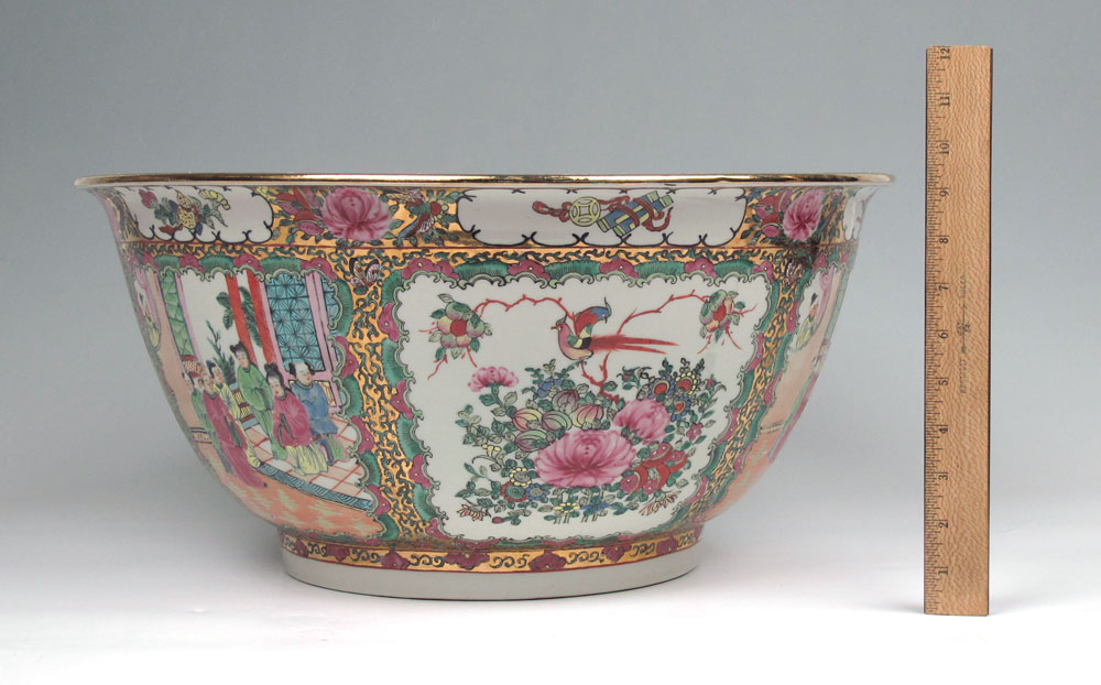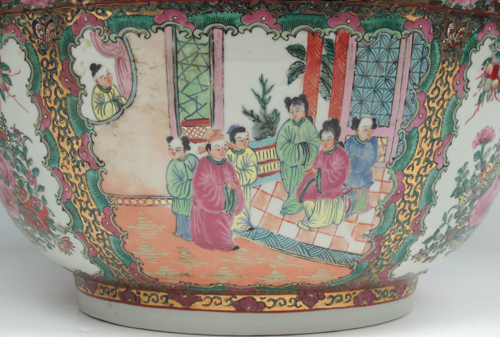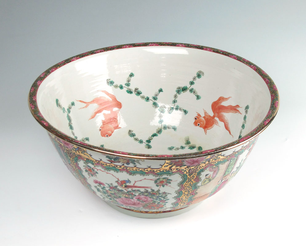 LARGE CHINESE ROSE MEDALLION BASIN BOWL: Approx. 20'' dia. x 9.5'' deep. Interior Koi decoration.