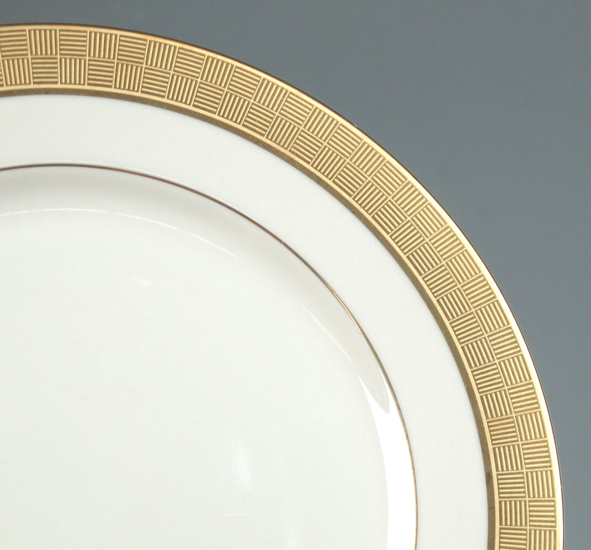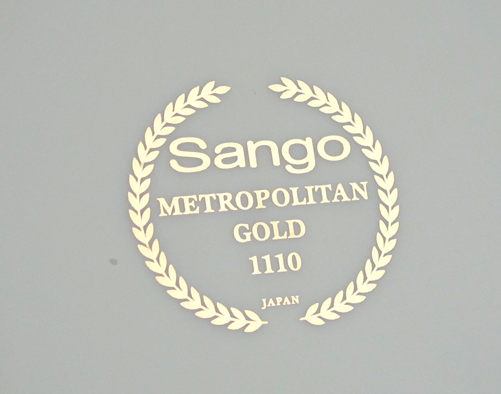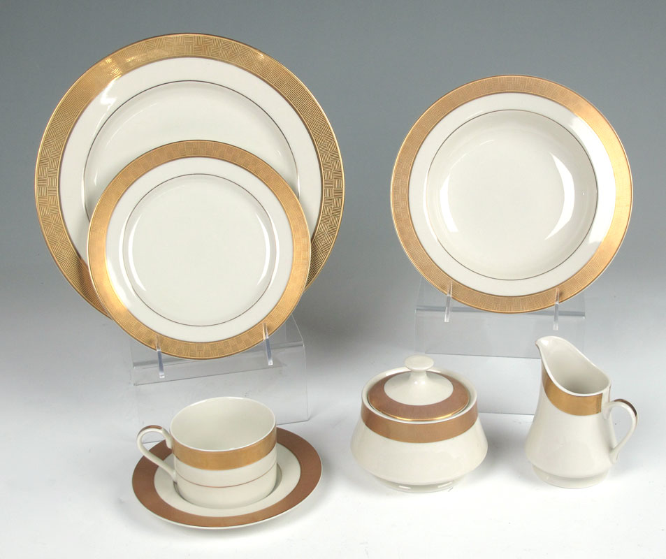 SANGO ''METROPOLITAN GOLD'' FINE CHINA SERVICE: 43 pieces to include 8 each of dinner plates (10 3/4''), salad plates, soup bowls, cups and saucers. There is also a sugar bowl, creamer, and 11 1/2'' chop plate.