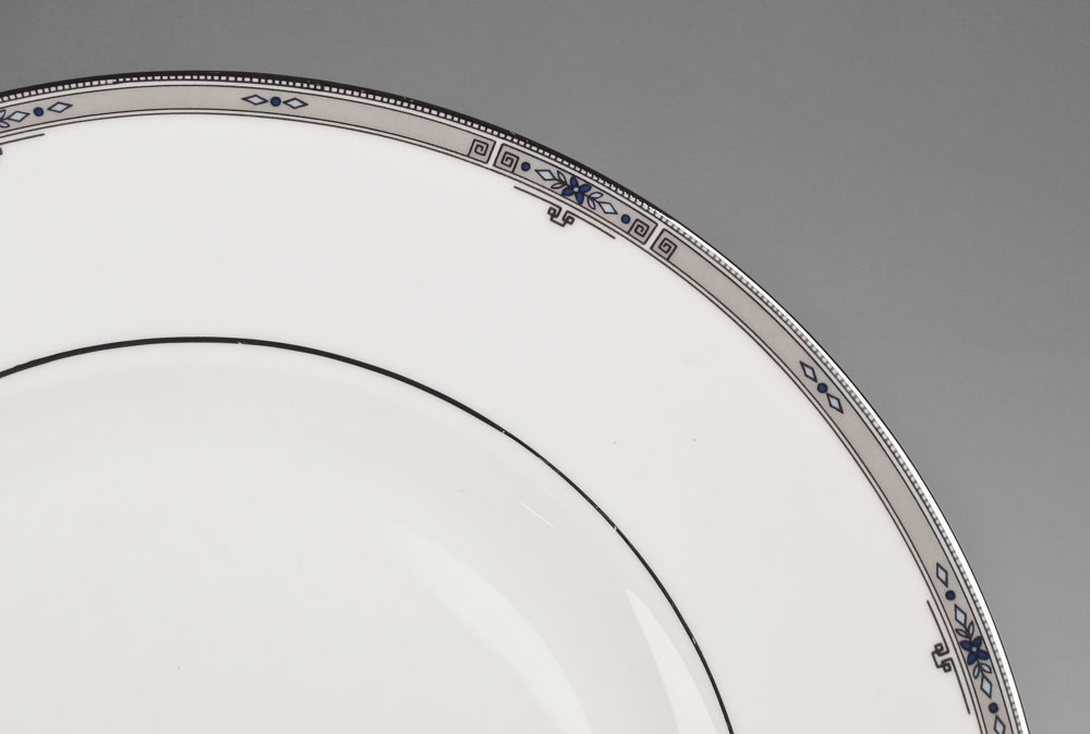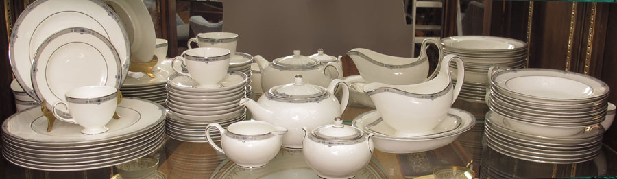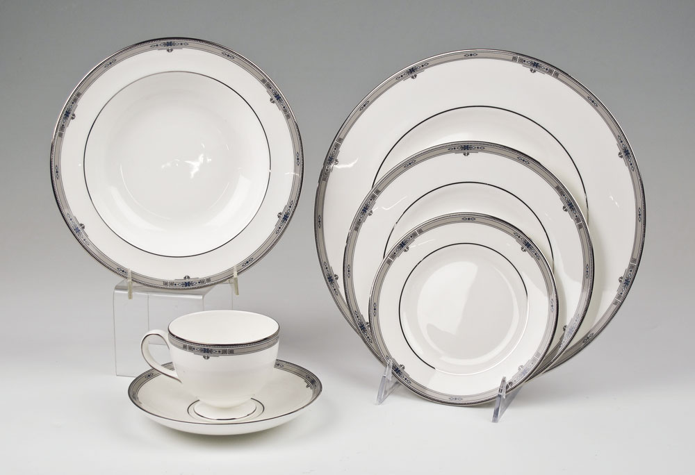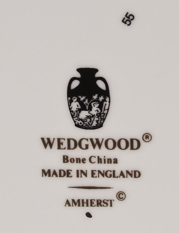 WEDGWOOD BONE CHINA IN THE AMHERST PATTERN: 53 piece service for 8 to include: 8 Dinner Plates (10 3/4''), 8 Salad Plates, 8 Bread Plates, 8 Soup Bowls, 8 Cups, 8 Saucers, 1 Covered Vegetable, 1 Gravy, 1 Covered Sugar, and a Tea Pot.