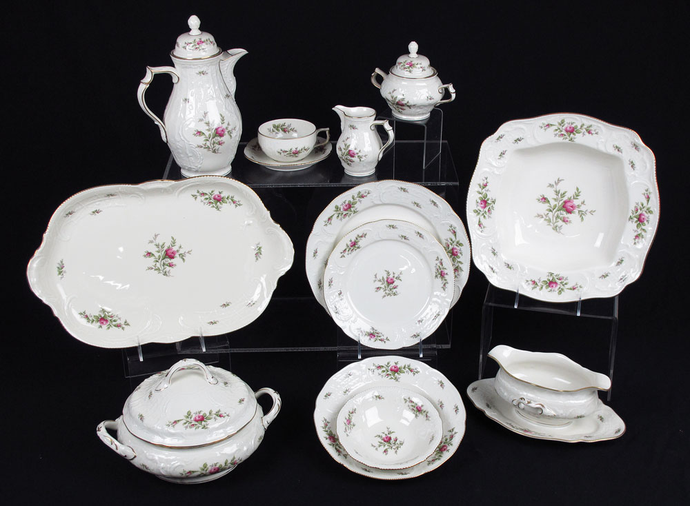 ROSENTHAL CLASSIC ROSE CHINA SERVICE FOR 8: Approx. 71 pieces to include 8 each of dinner, salad and bread plates, soup bowls, cups and saucers. The serving pieces are the 15.5'' platter, 11'' serving bowl, covered vegetable, coffee pot, cream and sugar.