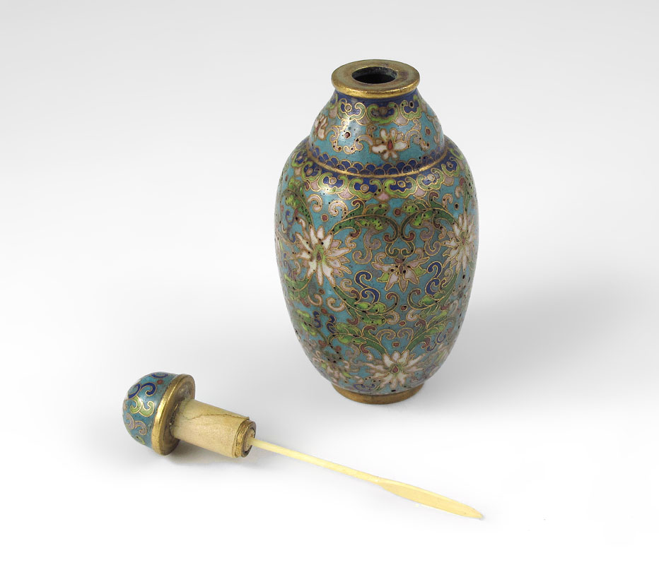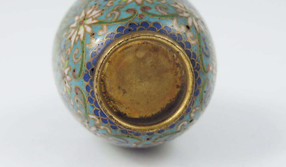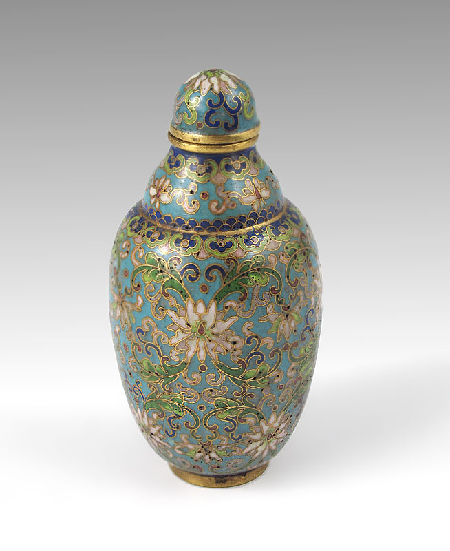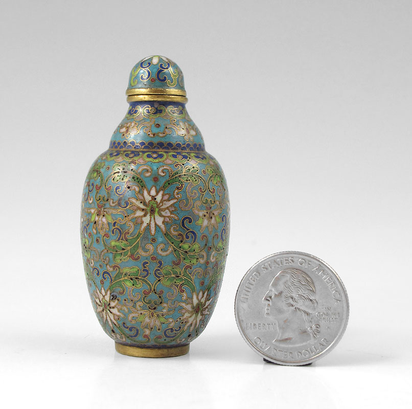 MINIATURE CLOISONNE SNUFF BOTTLE: Bulbous body with lid and attached ivory spoon, 1 9/16''h.
