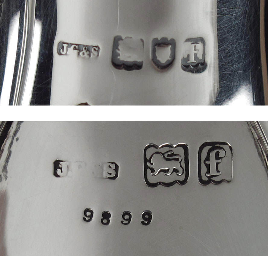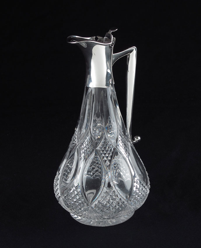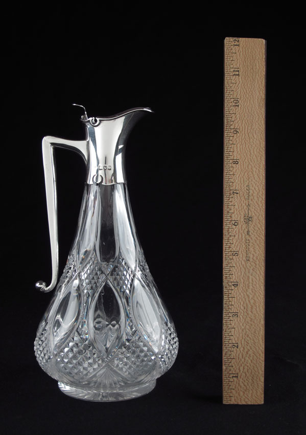 JOHN GRINSELL & SONS 1901 ENGLISH SILVER MOUNTED CLARET JUG: Silver mounted spout and handle marked with hallmarks for John Grinsell & Sons, London, 1901. Cut glass body. 9 3/4'' h. x 5''.