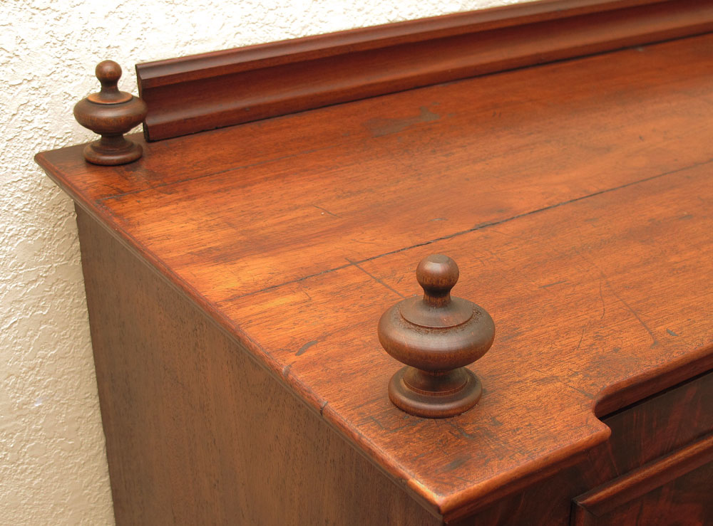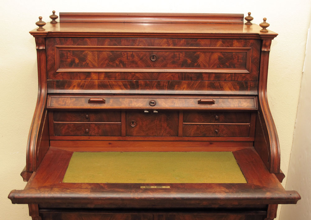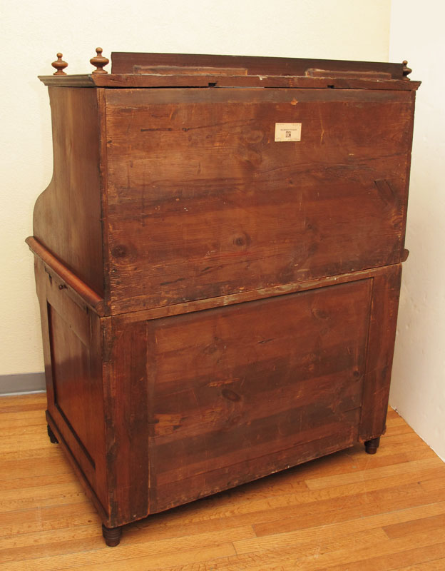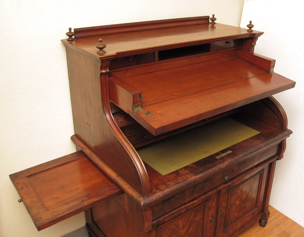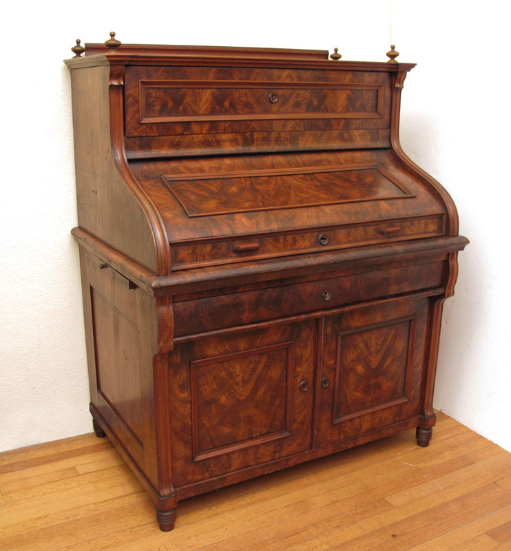 19TH CENTURY HIGH VICTORIAN ROLL TOP DESK: One of the most unusual we've ever seen, crotch grained walnut. Full length top drawer over canted cylinder roll type mechanism, 4 internal drawers and central door, green felt writing surface. Legal slides on either side of desk. Over full length drawer and 2 doors. On later added feet. Large chamfered panels on back. 53'' h. x 43 1/4'' x 29 1/4''.