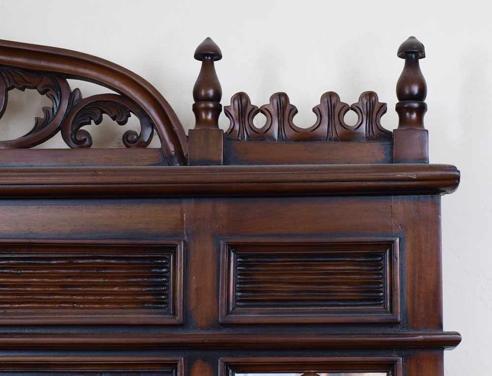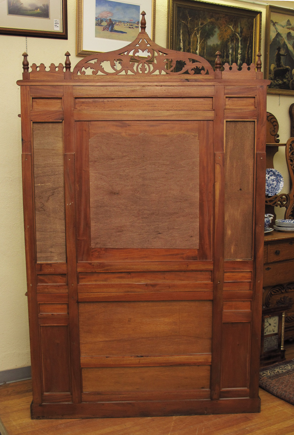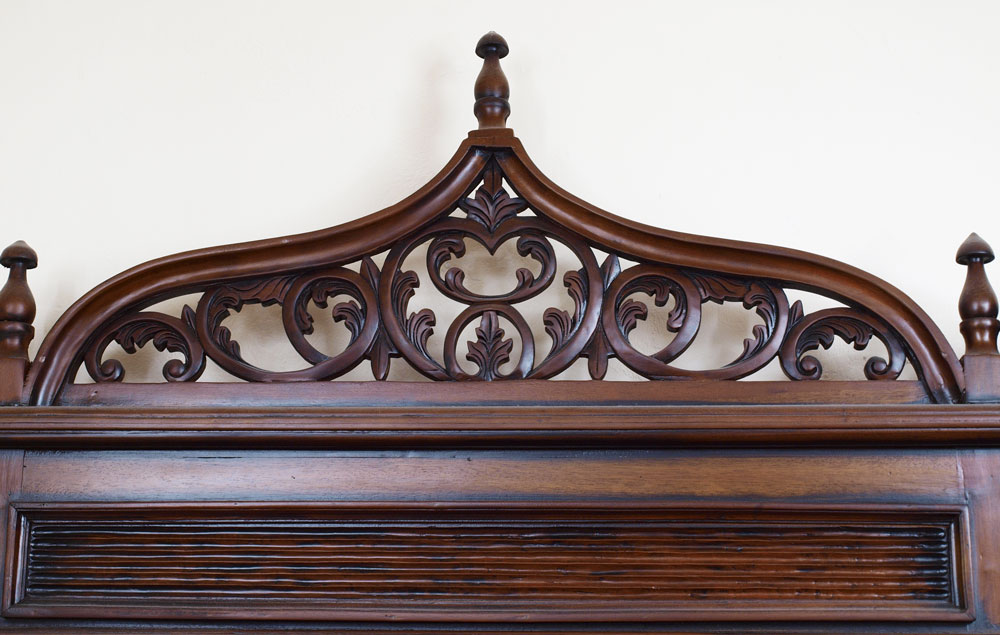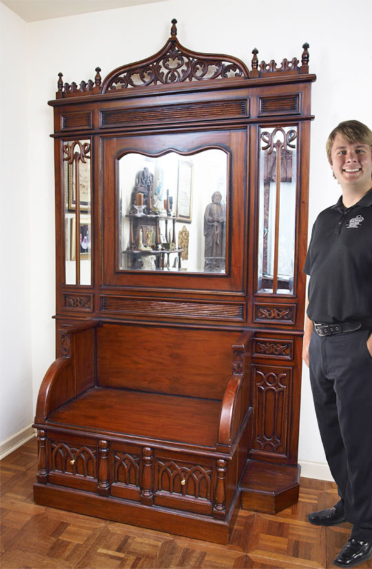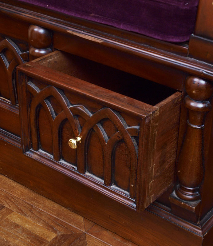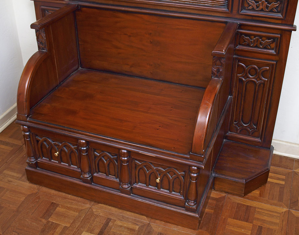 GOTHIC MOTIF MAHOGANY BISHOP'S CHAIR: Carved and pierced crest over shaped central beveled mirror surmounted by beveled mirrors with carved applied decoration. Deep bench seat with purple upholstered cushion over 2 drawers. 94 3/4'' h. x 57'' x 25''