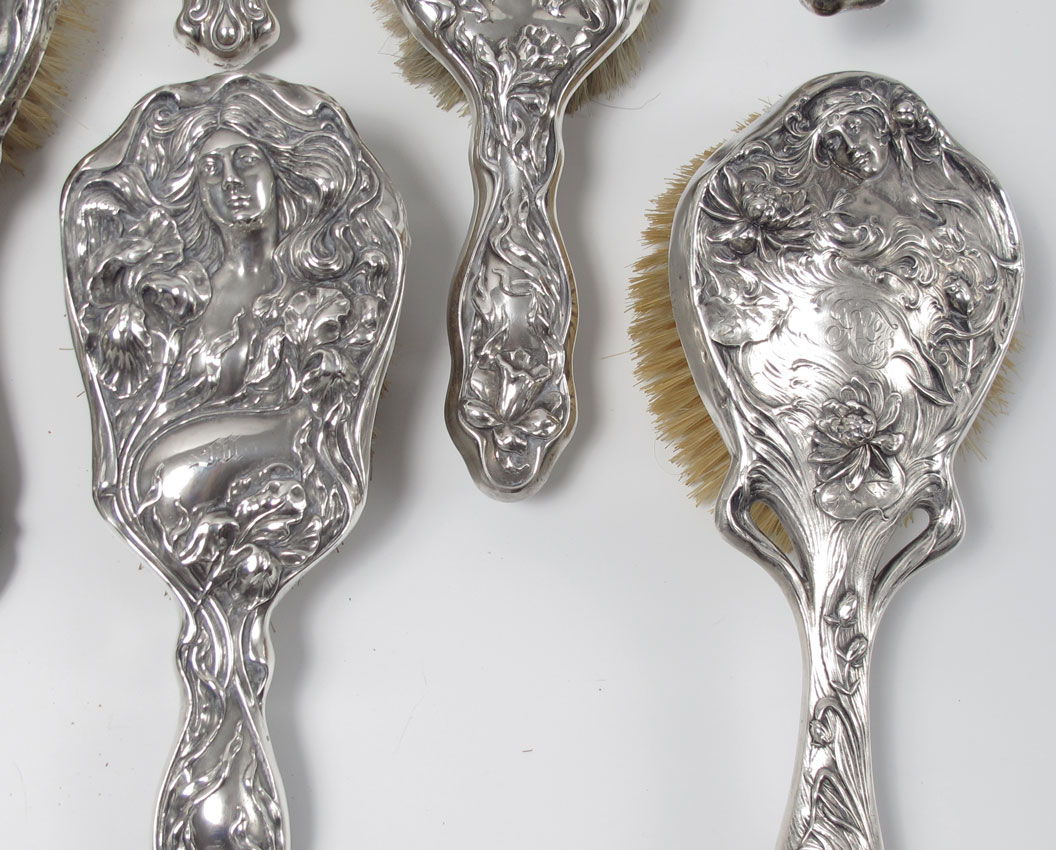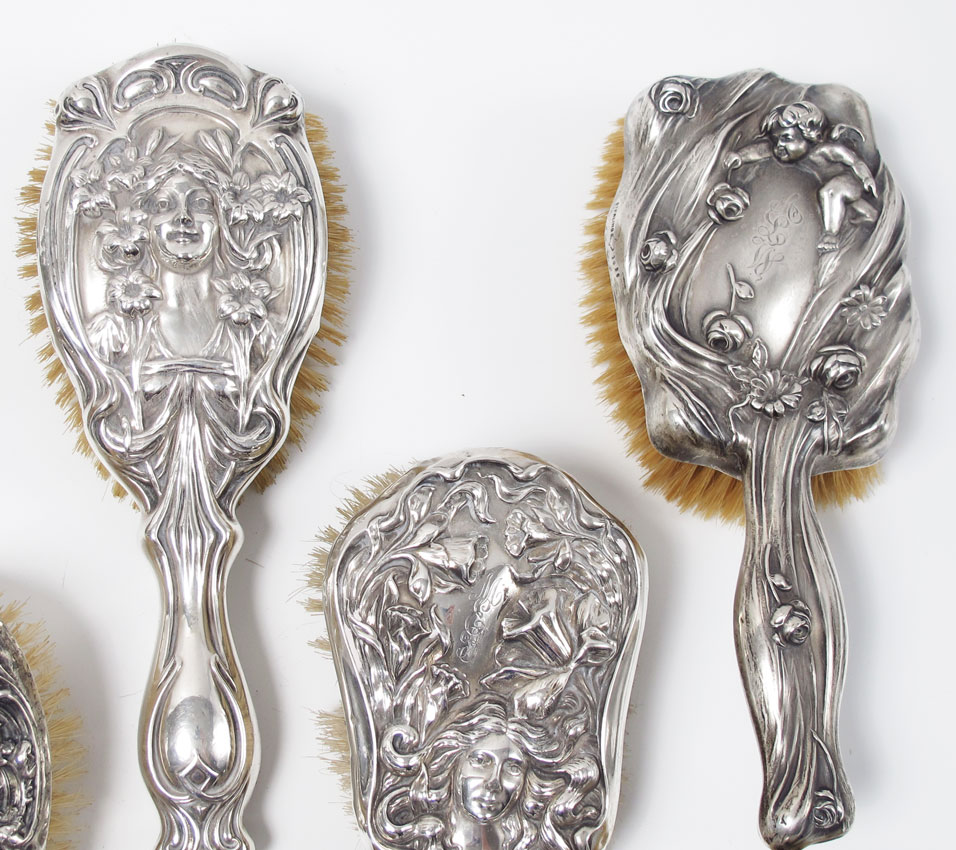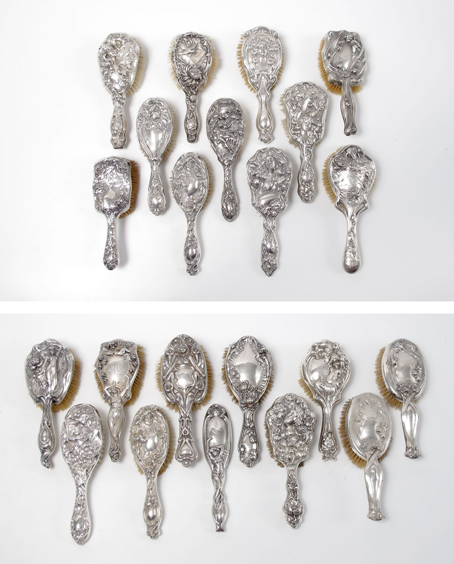 21 STERLING ART NOUVEAU FIGURAL HAIRBRUSHES: All marked sterling except as noted. 1 illegible hallmark, cupid at upper right pointing down. 1 unidentified hallmark, Sterling H, woman profile facing right. 1 Mauser winged brush w/ woman atop in swirls. 1 E&J Bass frontal bust of woman. 2 Foster & Bailey, 1 couple on swing, 1 woman's bust, inset, facing right. 9 marked sterling only to include 1 woman's bust facing forward amid flowers, 1 winged cupid atop with full woman handle, 1 woman handle with left hand behind head, 1 woman's head among flowers gazing upward and left, 2 women with long hair atop, 1 woman looking in mirror, 1 woman with her left elbow raised, 1 hummingbird. 2 LaPierre, both with woman atop facing left. 2 Simons Bros., 1 woman with arms astride pointing down, 1 woman upper left w/outstretched arms. 1 Woodside Sterling, butterfly woman. 1 Marshall Field, attributed, marked ''MF Sterling'', woman's head at center looking forward. Sold with 1 non-sterling, unmarked full figure woman with large rose to her right. Many pieces monogrammed, average length approx. 9''.
