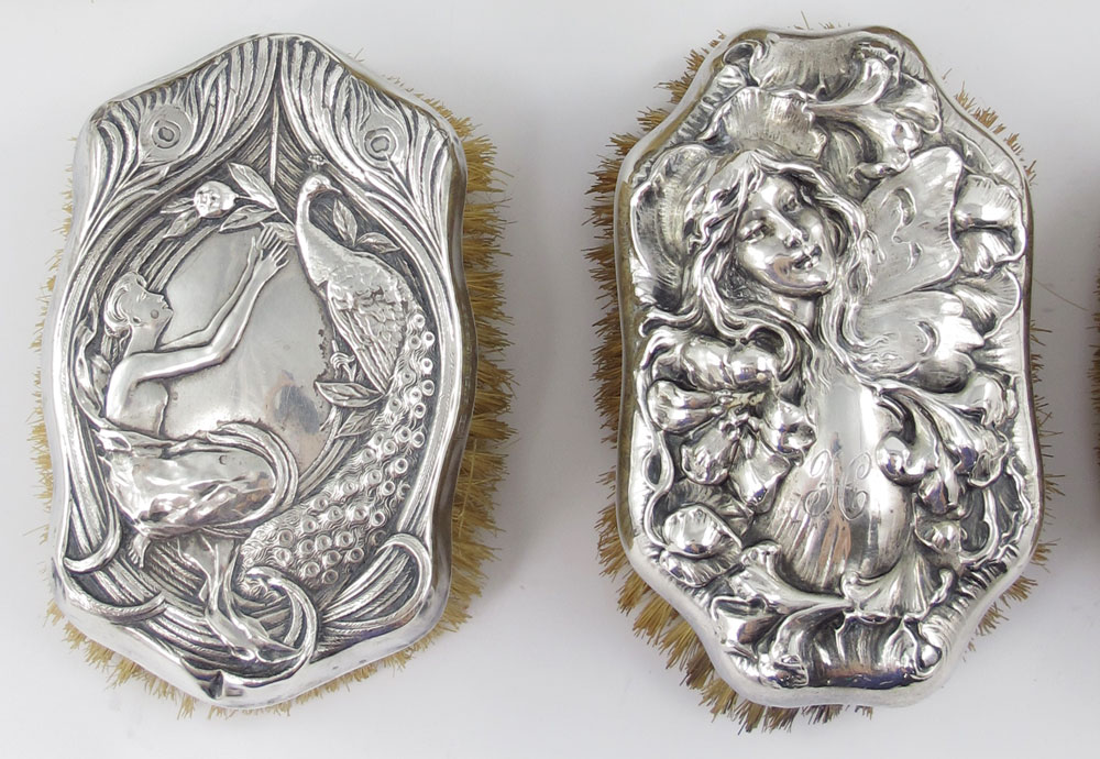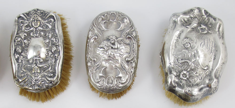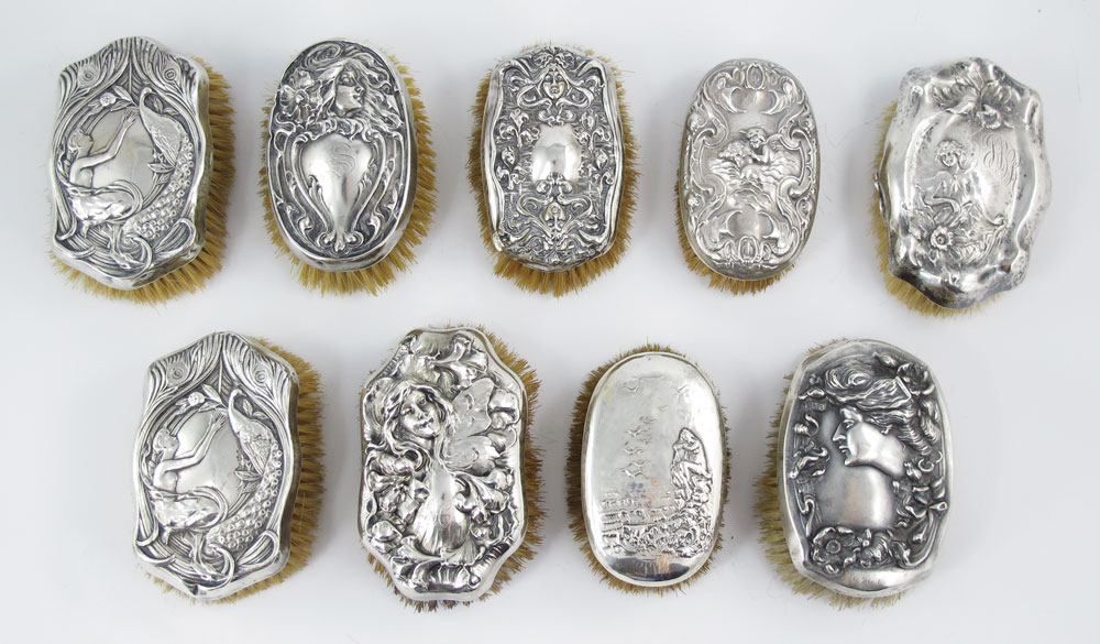 9 STERLING ART NOUVEAU MILITARY BRUSHES: All marked sterling to include 1) Woodside sterling butterfly woman. 2) Illegible hallmark winged woman. 3) Unidentified maker (Sterling H) woman in profile facing right. 4) 2 Foster & Bailey woman reaching for peacock. 5) Unger Brothers in art nouveau pattern. 6) Unger Brothers woman at the shore. 7) Unger Brothers Loves Dream pattern. 8) Woman's profile facing left, marked Sterling only. Most pieces monogrammed. Average size 4 5/8'' x 3 1/4'' x 2 1/4''.