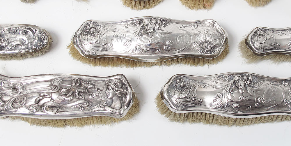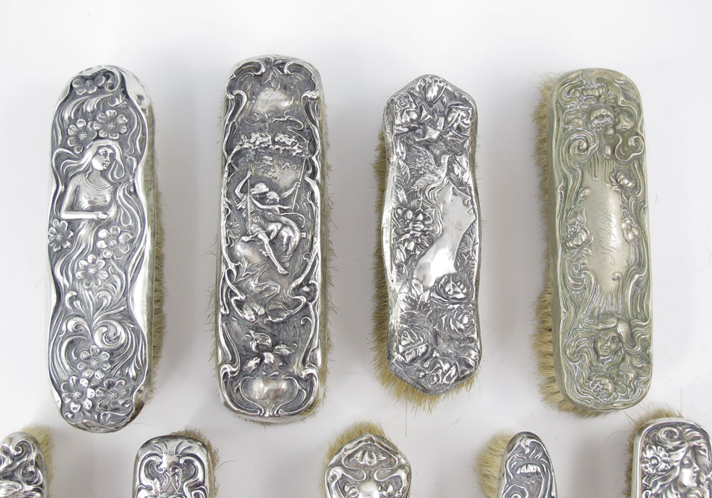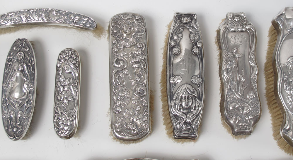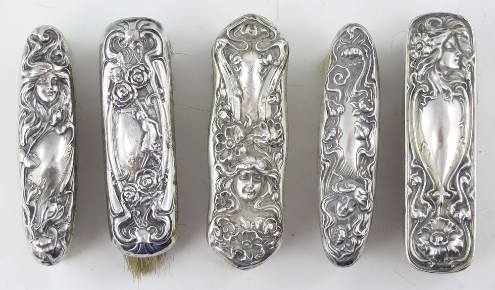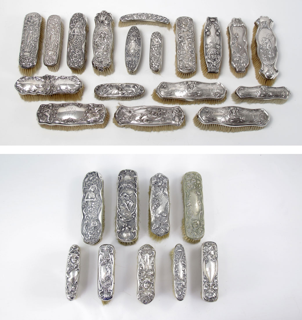 25 STERLING ART NOUVEAU CLOTHES BRUSHES: All marked sterling except as noted 9 marked sterling only 1 woman in center facing right, 1 top half of girl with spoon in hand, 2 standing woman with wreath in hand, 2 woman's face at bottom, 1 woman atop facing left, 1 with woman atop facing right, 1 with cupid to left and kneeling woman to right; 4 Simon brothers, 2 with woman with arms to either side, 1 woman's face at bottom, 1 with woman at bottom and left arm raised; 1 International Silver woman atop; 4 Foster & Bailey, 2 couple on swing, 1 woman on hammock, 1 woman facing right with bird on head; 4 Mauser, 1 woman prancing, 3 woman mid center top in swirls; 1 unidentified maker (sterling H) woman's face atop looking right; 2 obliterated hallmark standing matronly woman looking right. Sold with 2 non-sterling, 1 sterling woman at bottom, 1 Derby Silver woman to right amid flowers and swirls. Many monogrammed. Largest brush measures 8'' x 2 1/2'' x 2 1/4''.