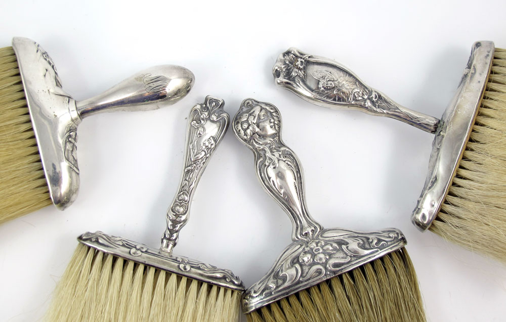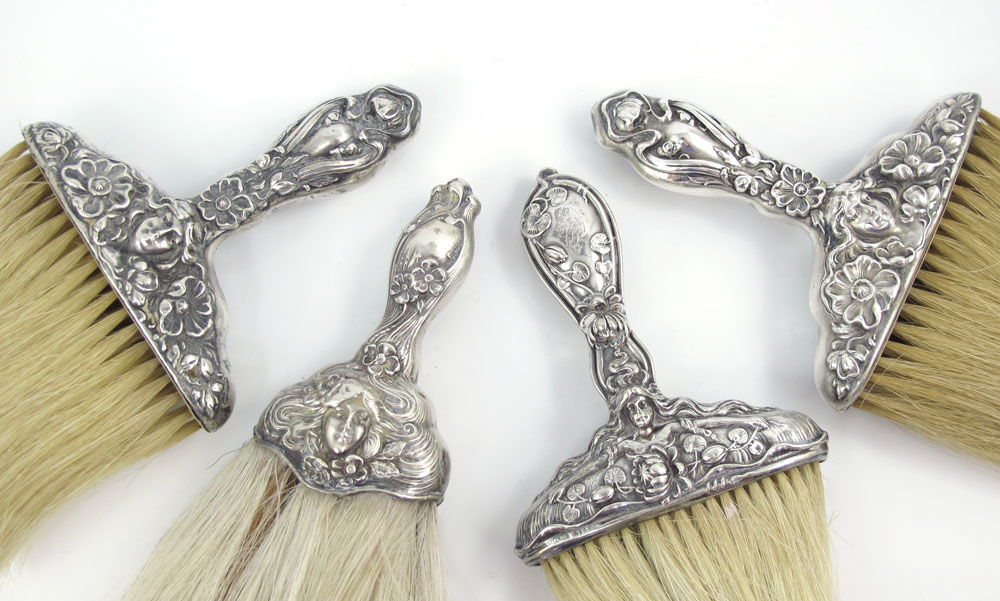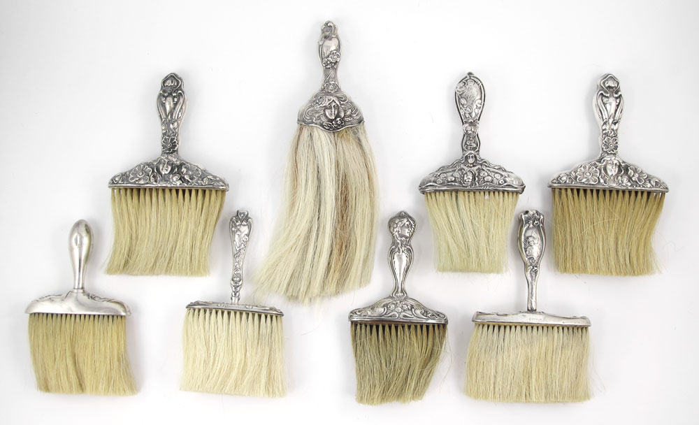 8 TOTAL STERLING BONNET FIGURAL BRUSHES: All marked sterling 1 Gorham young girl with butterfly; 1 unidentified maker (letter H in a diamond), winged woman; 1 unidentified maker (Sterling H) woman in profile facing right; 2 Simons Brothers, 1 woman with outstretched arms, 1 woman looking upward; 3 marked sterling only, 1 woman in a swirl, 2 woman's face among flowers. 2 monogrammed. Longest with bristles measures 9 3/4'' overall.