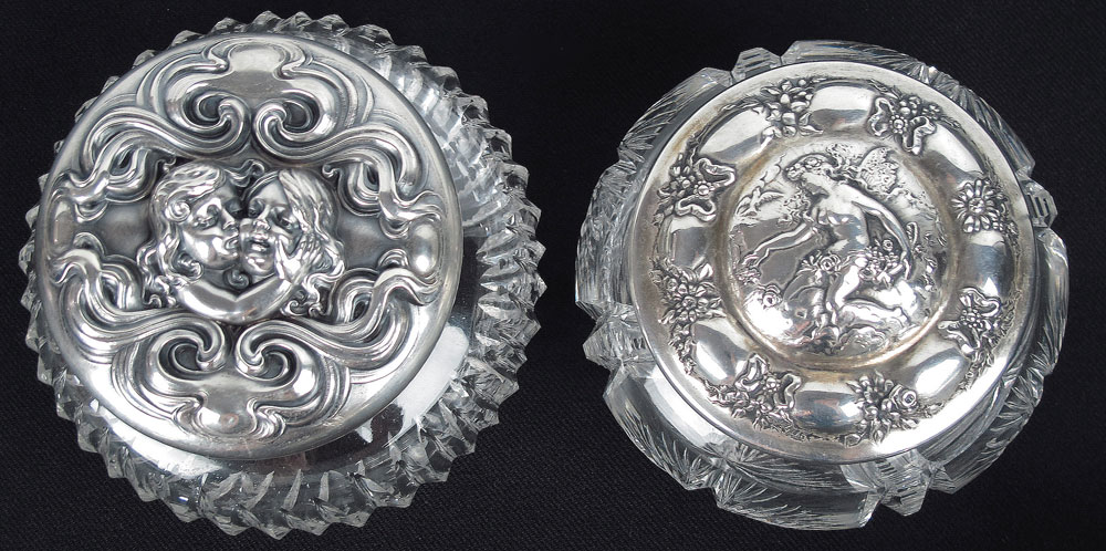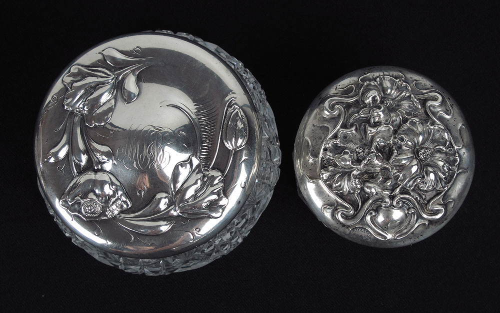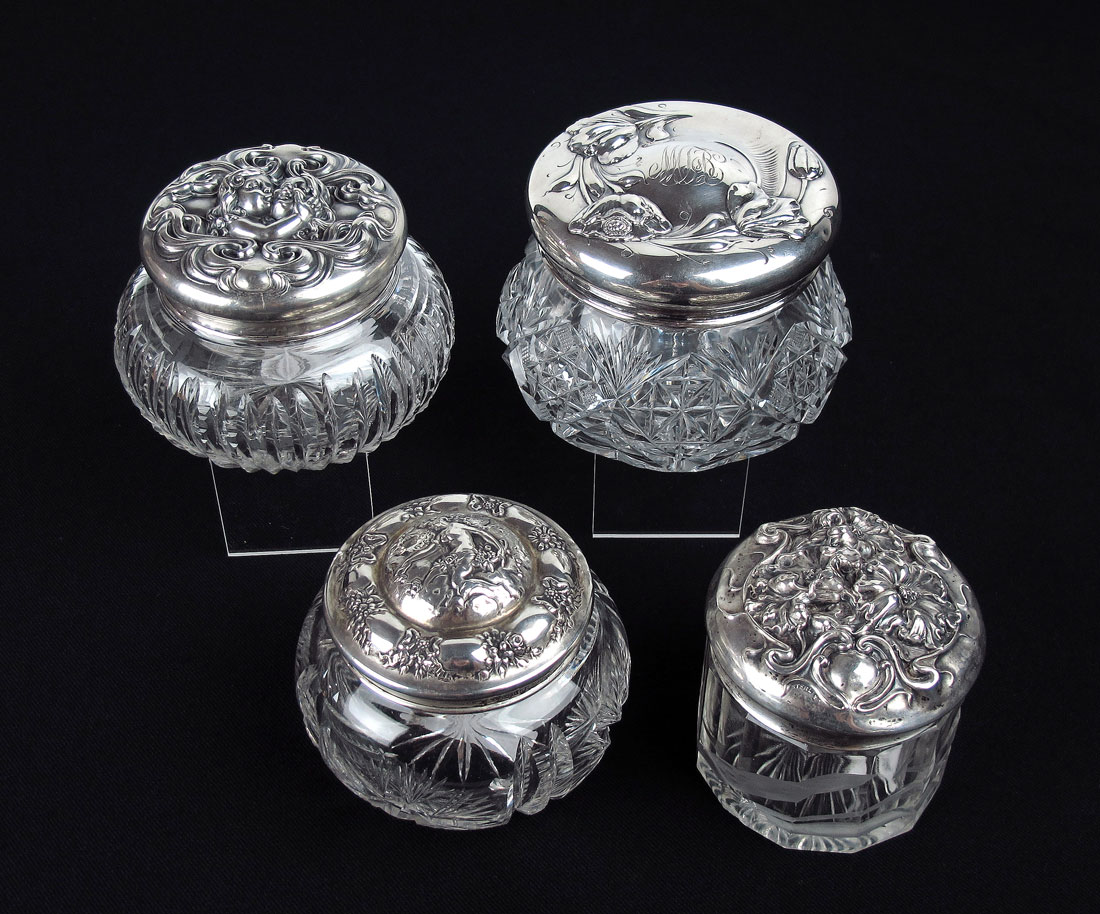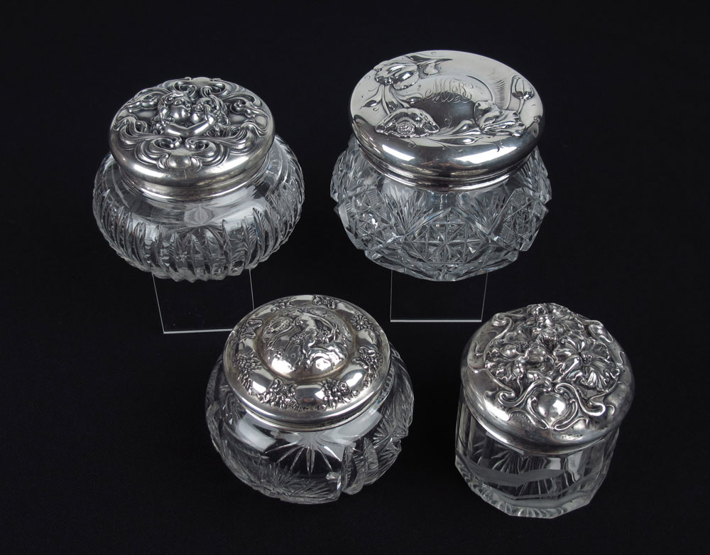 4 ART NOUVEAU STERLING LIDDED DRESSER JARS: To include 1) Wallace winged woman with bird. 2) Unger ''Stolen Kiss''. 3) Floral marked Sterling. 4) Shiebler floral, monogrammed, 3 1/4'' h x 4 1/4''. Approx. 4.7 troy oz.