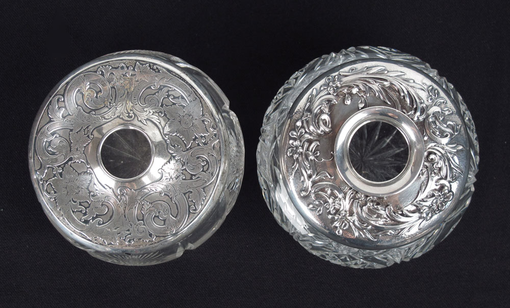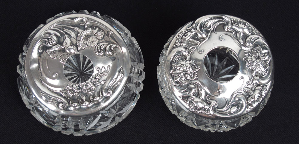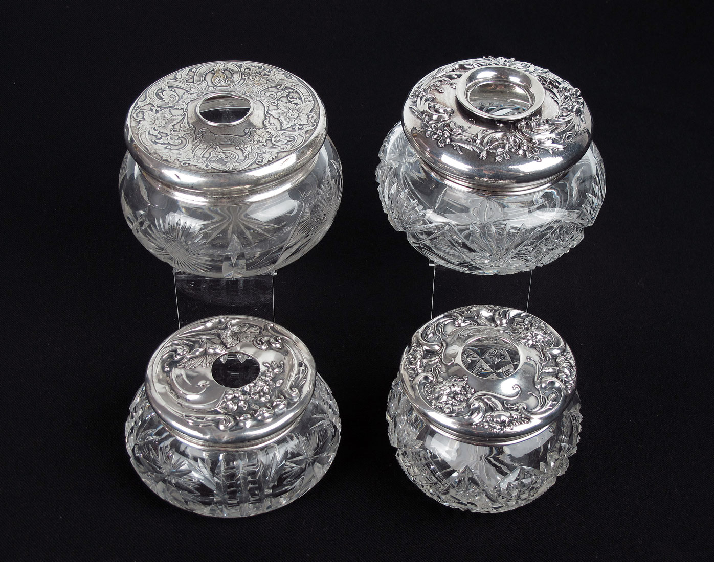 4 ART NOUVEAU STERLING LIDDED HAIR RECEIVERS: To include 1) Wallace floral motif. 2) Marked Sterling floral motif. 3) Webster floral motif. 4) Kerr floral motif, 3 3/4'' h. x 4 1/2'' dia.
