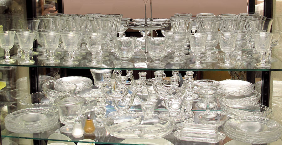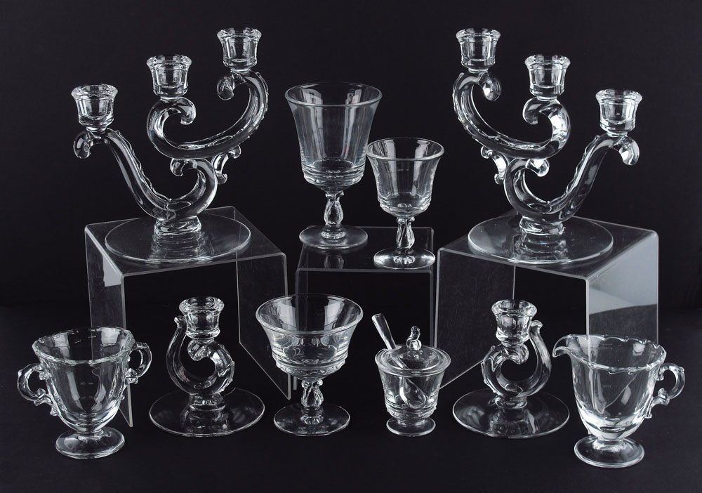 FOSTORIA CENTURY PRESSED GLASS: Approx. 58 pieces to include, 8 Water, 8 Ice Tea, 8 Sherbets, 8 Wine (cloudy), 8 Salad Plates (8''), 2 plates (7 1/2''), Sugar, Creamer, pickle dish, Tiered tid bit tray, 3 part relish, covered butter, mustard, covered candy dish, pair 3 light candlesticks (8''), single light candles (4 1/2''), nappy bowl, trianglar footed dish, and 2 misc. bowls.