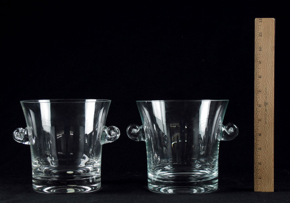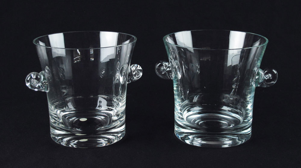 TWO TIFFANY & CO CRYSTAL CHAMPAGNE / ICE BUCKETS: Approx. 6 1/2'' tall x 7 1/2'' dia., including the swirl handles.