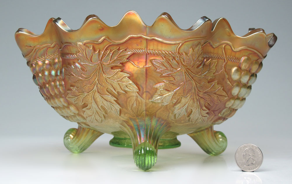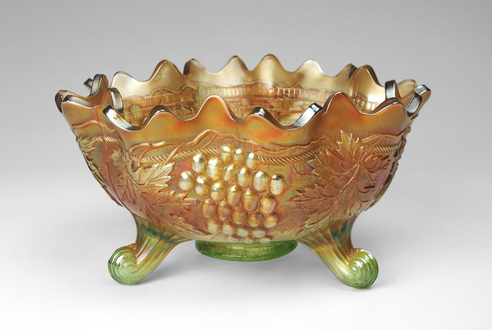NORTHWOOD CARNIVAL GLASS GRAPE & CABLE FOOTED BOWL: Footed centerbowl in the Grape and Cable pattern by Northwood. Marigold color. Measures 5 1/2'' h. x 10'' dia.