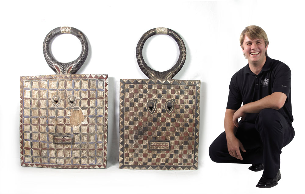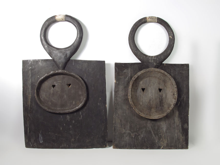 CARVED AFRICAN BAULE MASKS - IVORY COAST: 43 1/2'' X 27'' X 3'' & 44'' X 24'' X 3''.