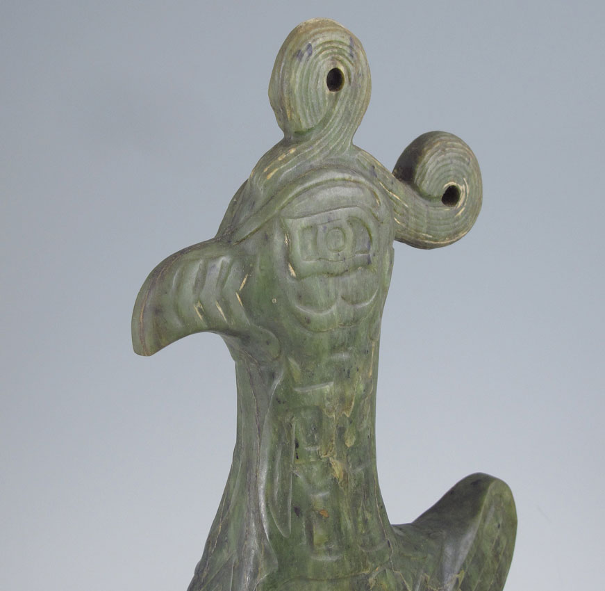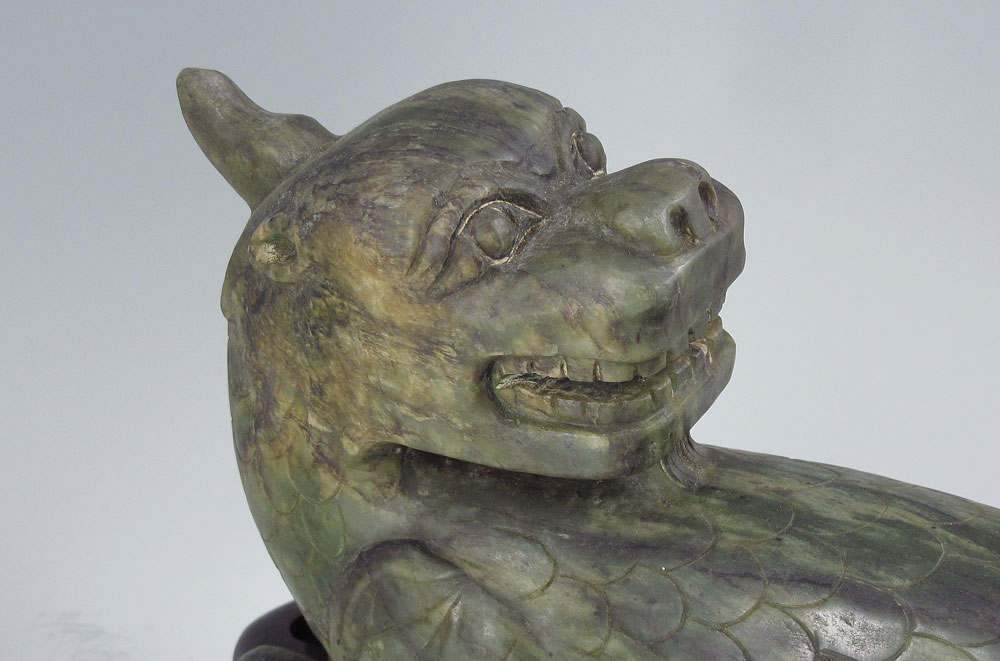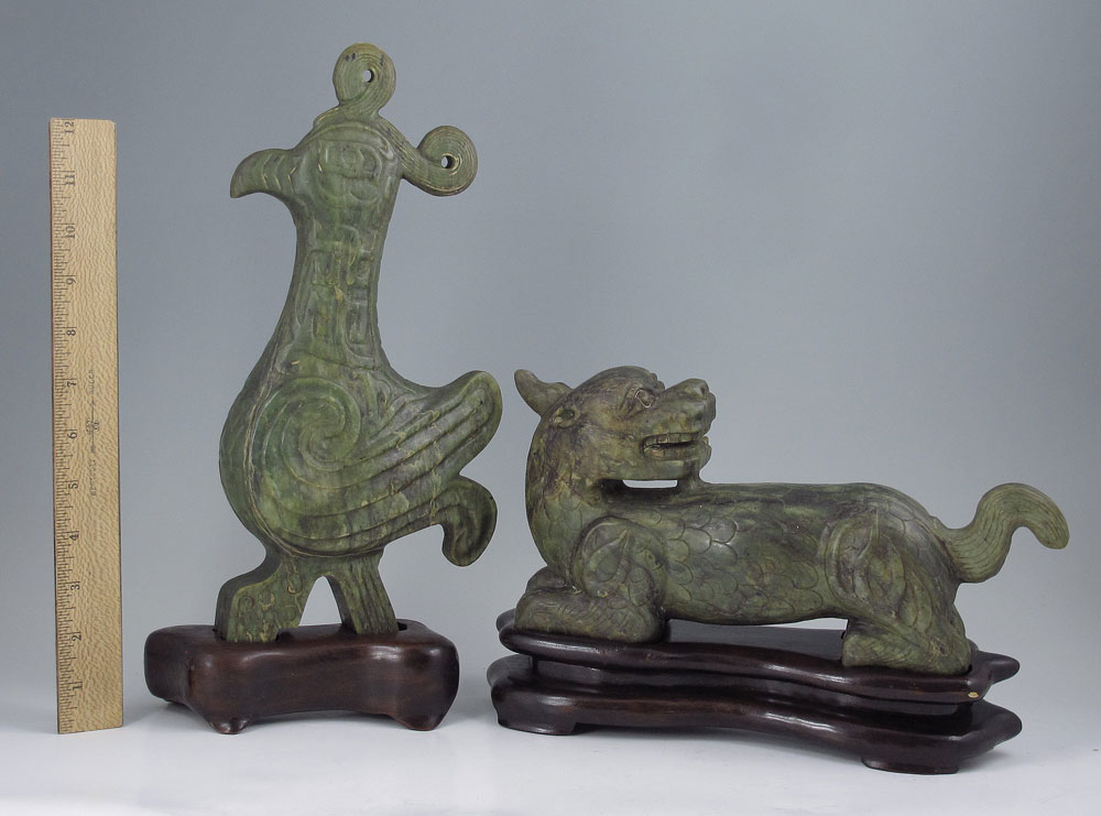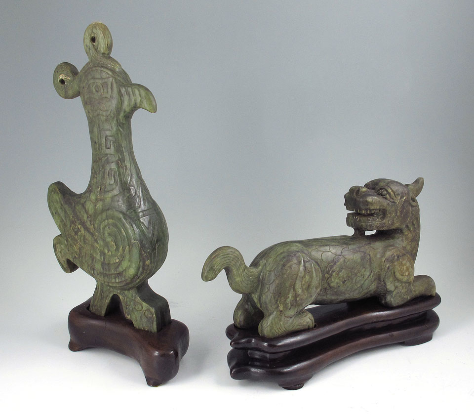 2 CARVED SOAPSTONE ORIENTAL ANIMAL FIGURES WITH STANDS: 1) Bird, 12 1/2''h. x 6'' x 2 3/8'', custom stand 1 3/4''h. x 6'' x 2 3/4'' and 2) Foo Dog, 5 1/2''h. x 11 1/4'' x 2 3/4'', custom stand with slight warp, 2''h. x 11'' x 3 1/2'', with velvet lined presentation box.
