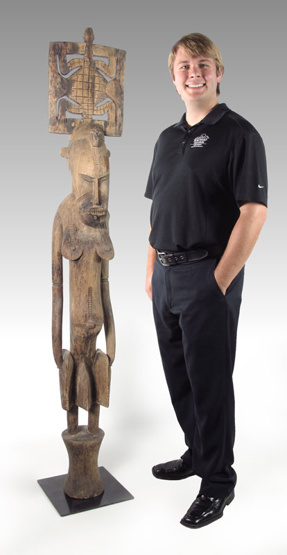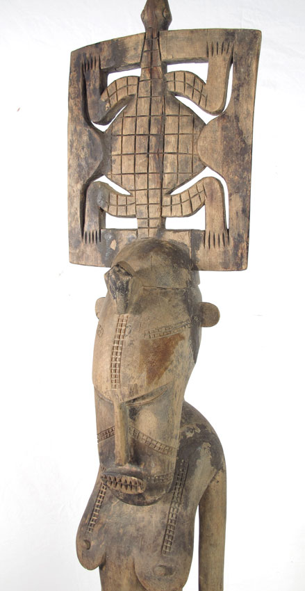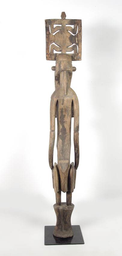 CARVED AFRICAN SENUFO PORO SOCIETY FIGURE - IVORY COAST: 48LBS., 70'' x 12'' x 12'' ON METAL BASE.
