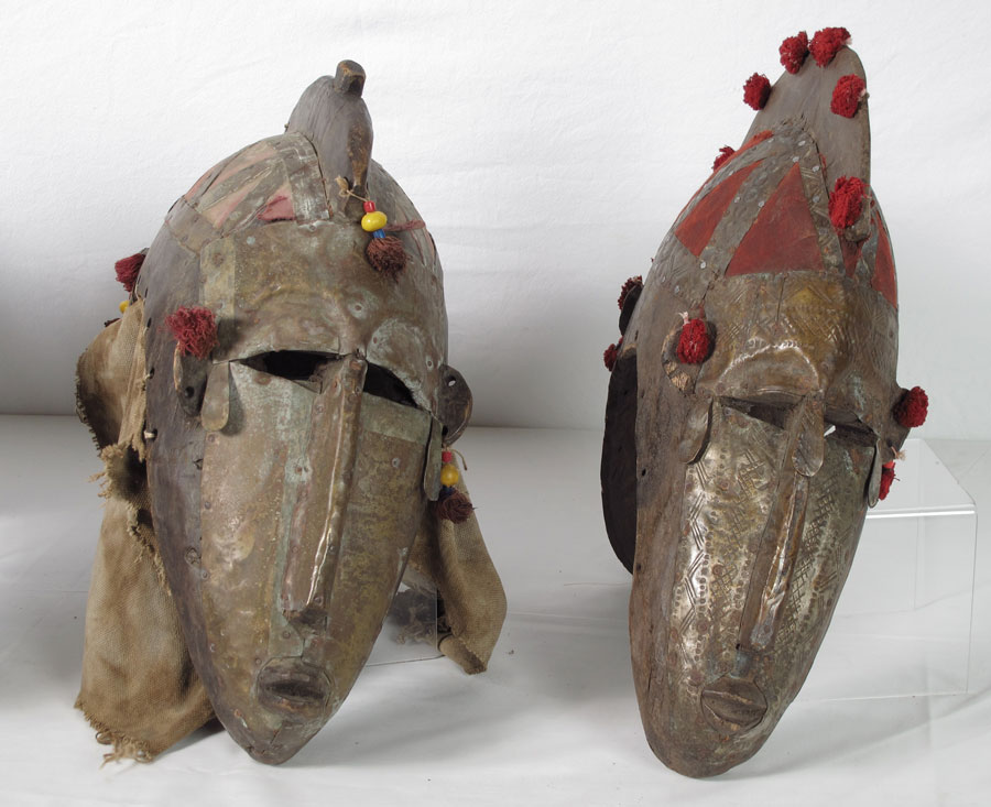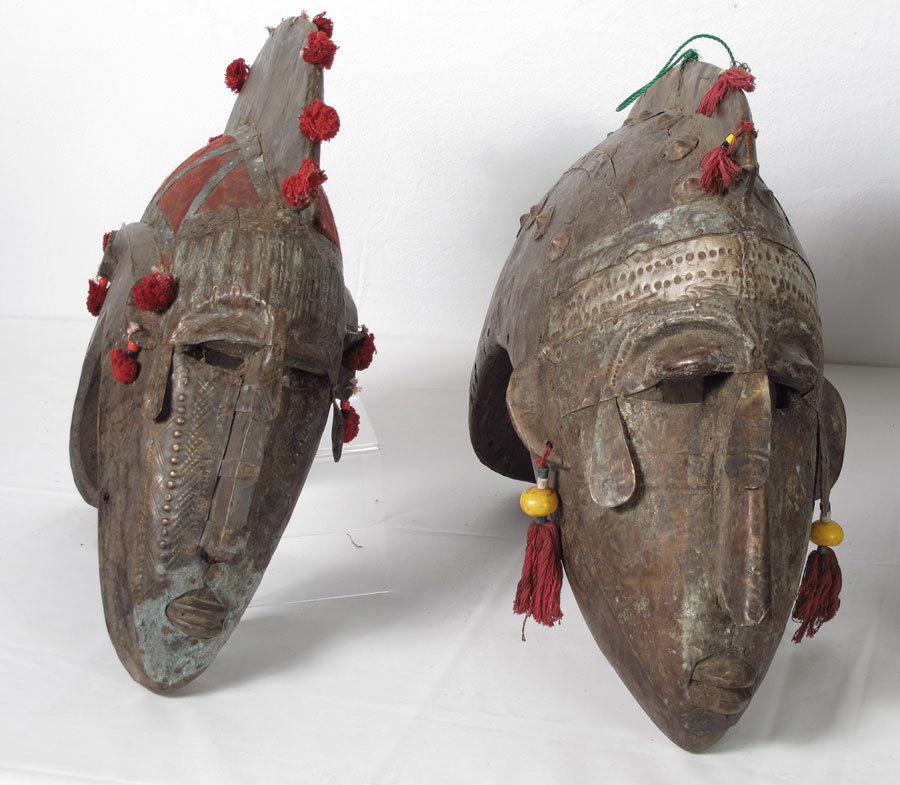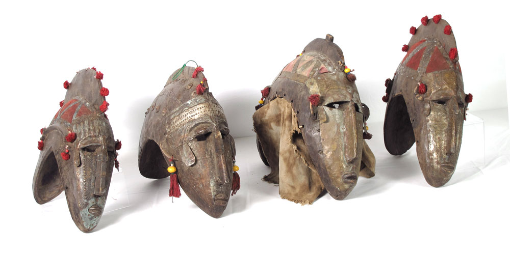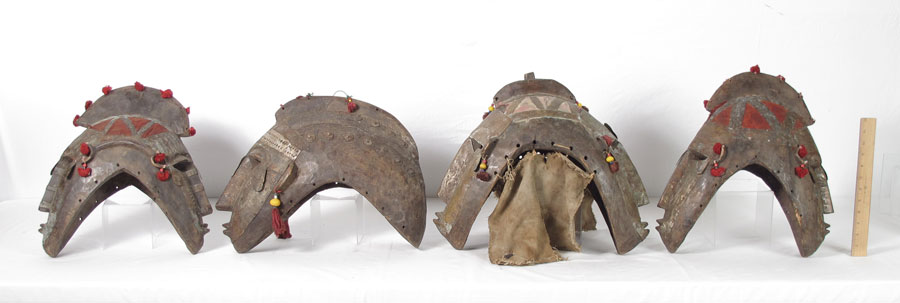 4 CARVED AFRICAN BAMELEKE JANUS HEADS: 7 1/2 LBS., 3 1/2 LBS., 5 LBS., & 7 1/2 LBS. 14'' x 7'' x 19'' & 16'' x 8'' x 19'' & 17'' x 6 1/2'' x 16'' & 18'' x 6'' x 16''.
