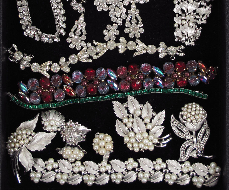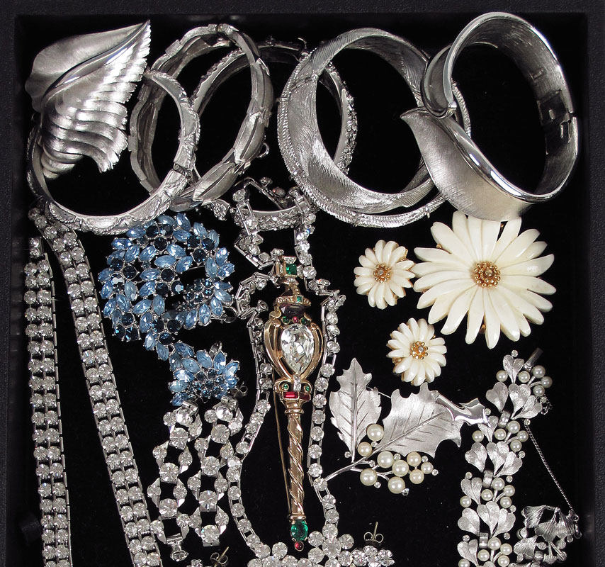 TRAY LOT VINTAGE COSTUME JEWELRY: The red and purple bracelet is signed KRAMER. The faux pearl silver tone pieces are signed TRIFARI, pair of faux pearl earrings are signed MARVELLA, signed and unsigned WEISS rhinestones, the 4'' long scepter pin and blue brooch and earrings are signed TRIFARI, flower set s signed MONET. The 5 hinged bangles are signed TRIFARI, as is the sea shell pin. Another bangle is signed MONET.