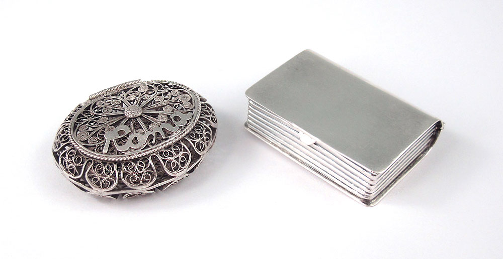 2 MINIATURE SILVER BOXES: Mexican Sterling ''Book'' pill box, hinged lid, marked Plat.Mex.S.A 925 Eagle mark 20, 1 1/2'' x 1 1/8'' x 3/8'', .5 Troy oz. and an Italian 800 silver wire work lidded basket ''Roma'' on lid, 800 on bottom, 1 1/2'' x 1 1/8'' x approx. 1 /2''h., .295 Troy oz. Sold as a lot.