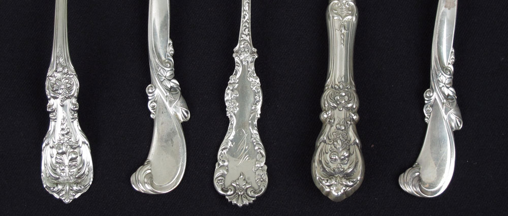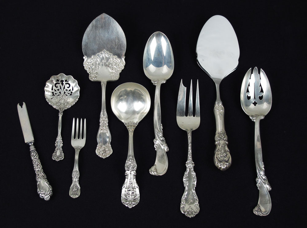 8 PIECE ESTATE STERLING SERVING PIECES: To include 1) Reed & Barton ''Francis I'' cream ladle (6 3/4''), cake server, 9 5/8'', child's fork (4 1/2''). 2) Wallace ''Waltz of Spring'' table spoon (8 1/2''), pierced tablespoon (8 1/4''). 3) Blackington fruit knife (6''), monogrammed. 4) International bon bon spoon (5''). 5) Unidentified fish fork (7 1/4''), monogrammed. Sold with a Rogers silverplate pie server, (8 5/8''). Approx. 12.2 troy oz.