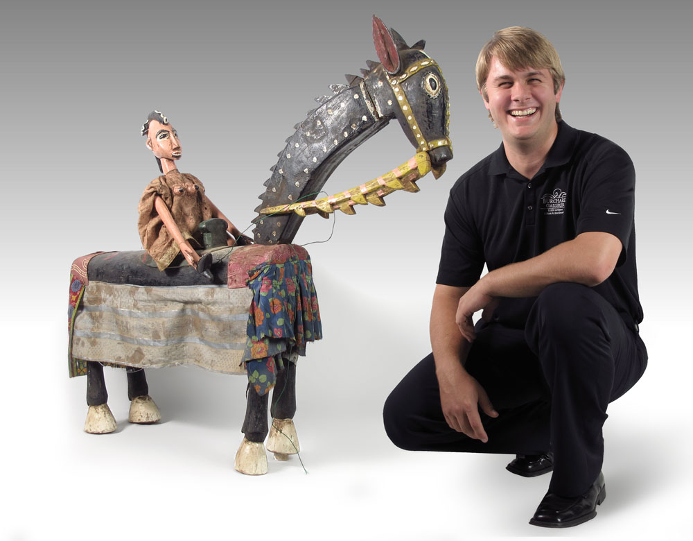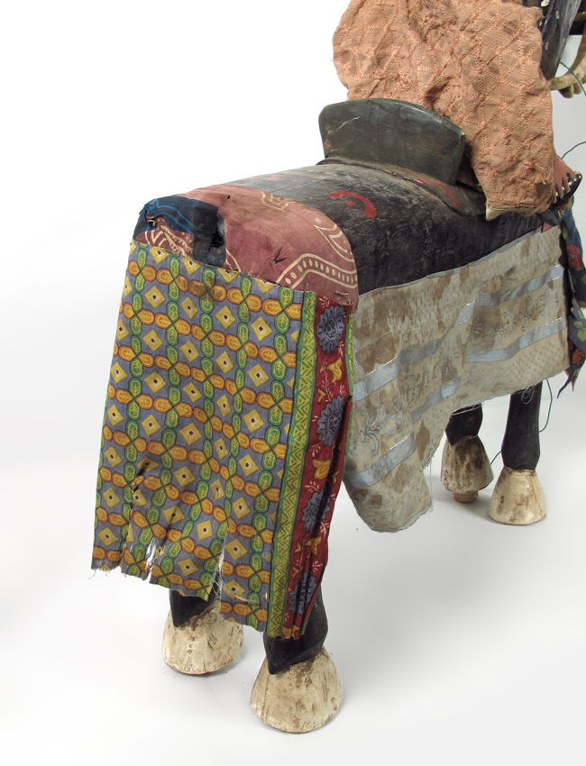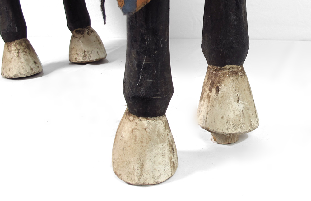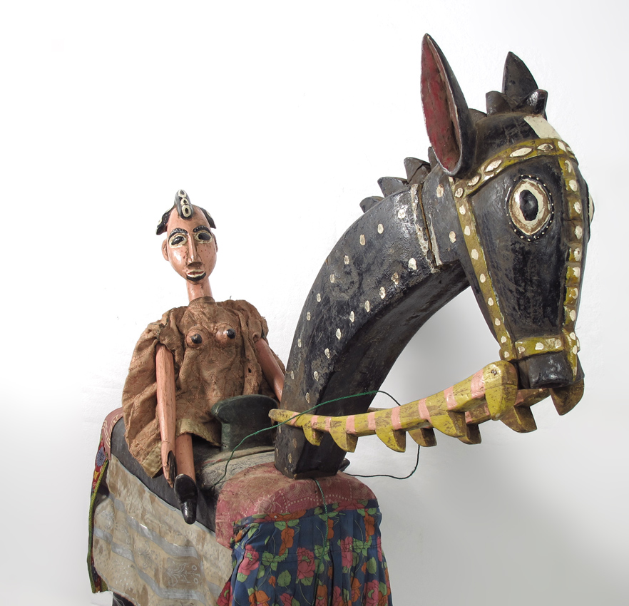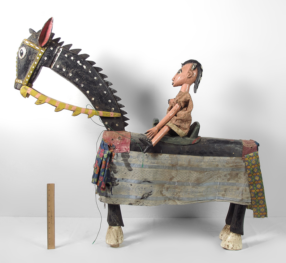 CARVED AFRICAN BAMANA HORSE AND RIDER PUPPET - MALI: 19 LBS., 42'' x 48'' x 10''.
