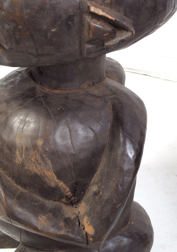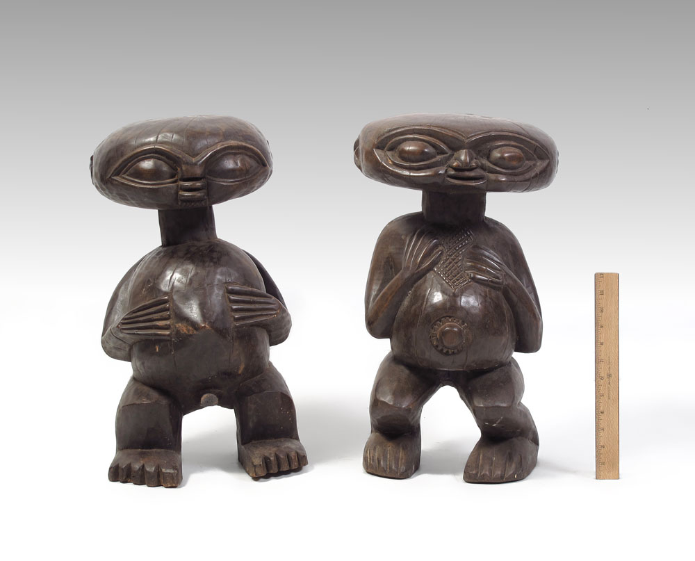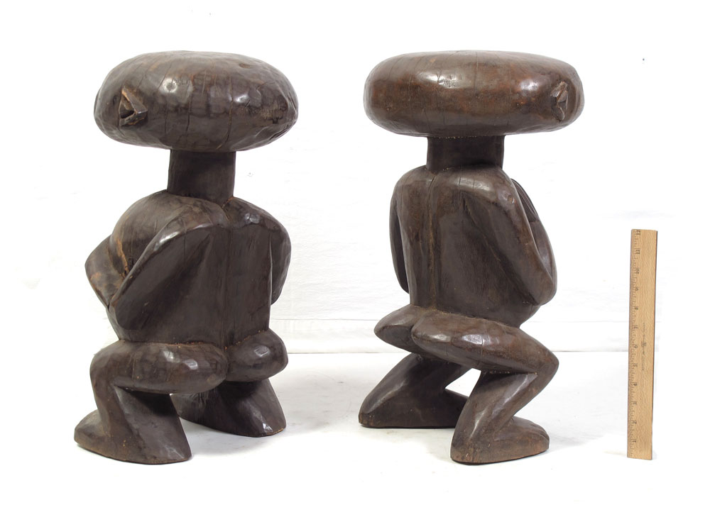 CARVED AFRICAN 2 PAIR PYGMY STOOLS: 2.5 LBS., & 18 LBS., 21'' x 10'' x 12'' & 21'' x 12'' x 12''.