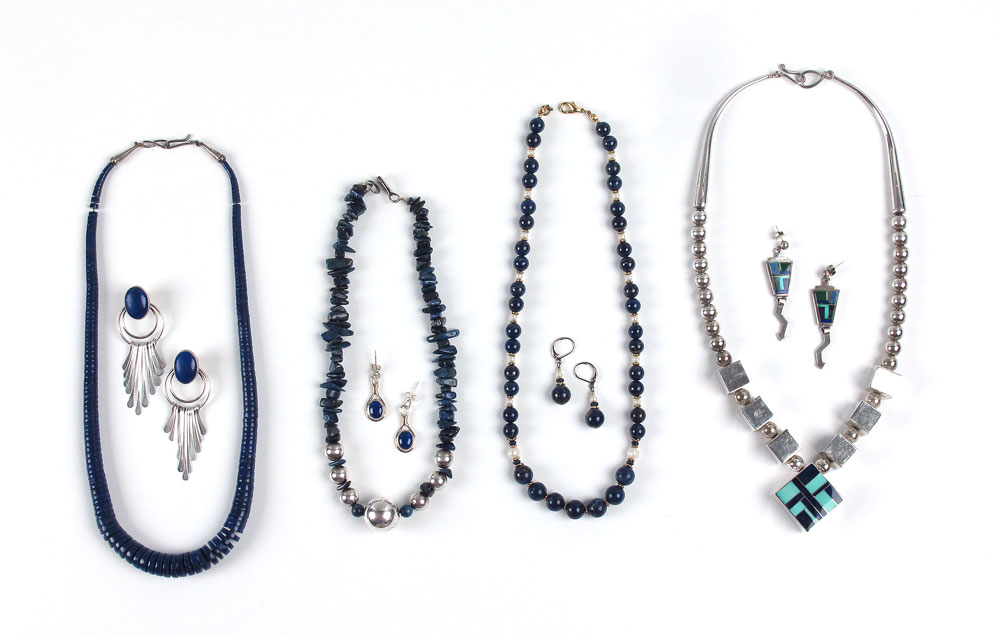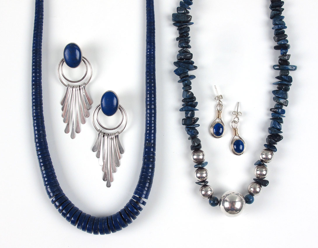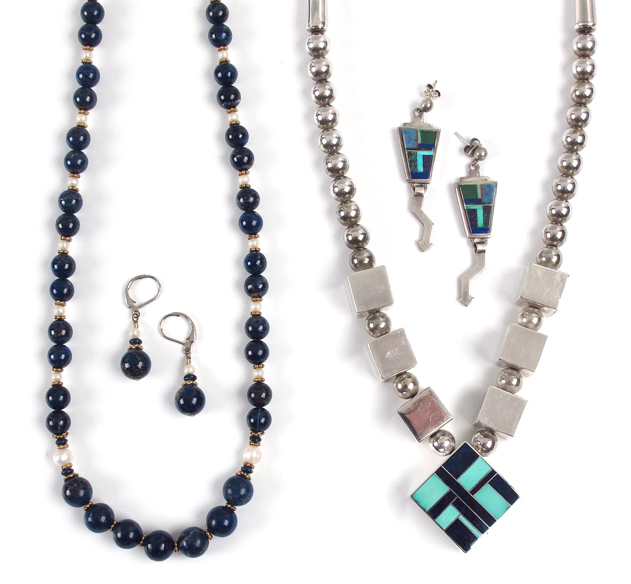 T.L. STERLING AND LAPIS JEWELRY: Estate lot to include, Tracey - Knifewing (Ray Tracey Jewelers), Navajo, necklace inlaid with lapis and turquoise, approx. 20'', 2.6 troy oz; Calvin Begay, Navajo, dangle earrings inlaid with assorted semi precious stone, 2 1/8''l., tiny dent to one corner, post and nut findings; Unsigned items to include, Graduated lapis disk necklace, 3.3mm to 12.5mm, approx. 21''l.; Lapis nugget and silver ball necklace, center ball 19mm, approx. 16''l.; Graduated lapis ball, pearl and gold? roundel necklace, largest lapis bead approx. 10mm, approx. 19''l. sold with matching dangle earrings. Two additional pair of earrings of sterling and lapis and sterling, gold and lapis.