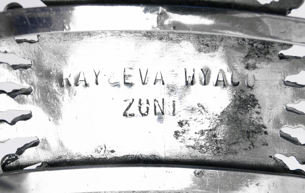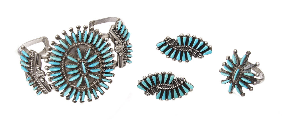 ZUNI PETIT POINT TURQUOISE AND SILVER JEWELRY: Cuff bracelet by Ray & Eva Wyaco with top 1 1/2'' wide, opening approx. 2 1/8'' x 1 5/8''; unmarked ring in the same design assumed to be by the same artist, size 7; complimentary earrings marked EZP, post and nut, 1 1/8''. Overall 1 Troy oz. inclusive.