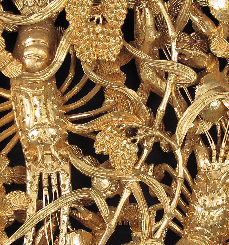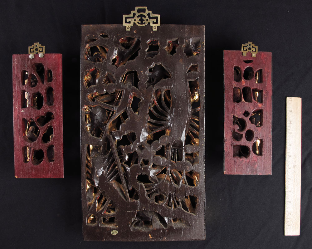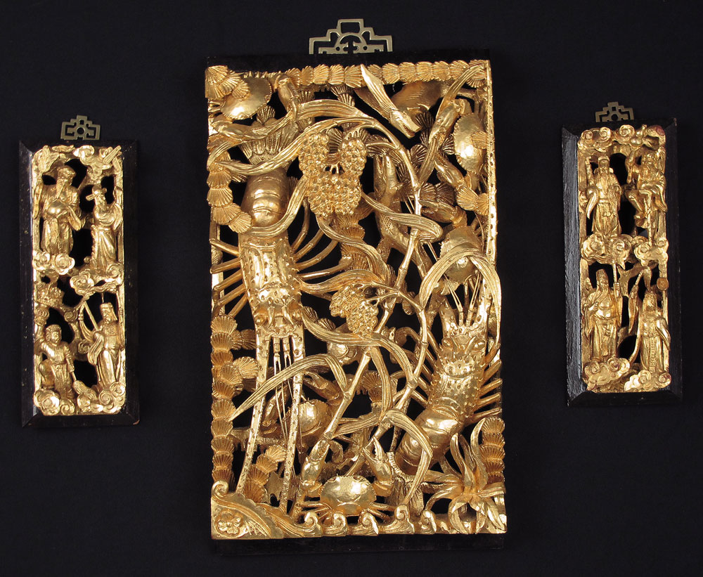 3 CARVED AND GILT WOOD CHINESE PANELS: The larger is an unusual vision of under the sea, 17 1/2' x 10'' x 2''. The smaller two are a pair, each with 4 Immortals, 10'' x 4'' x 2''.