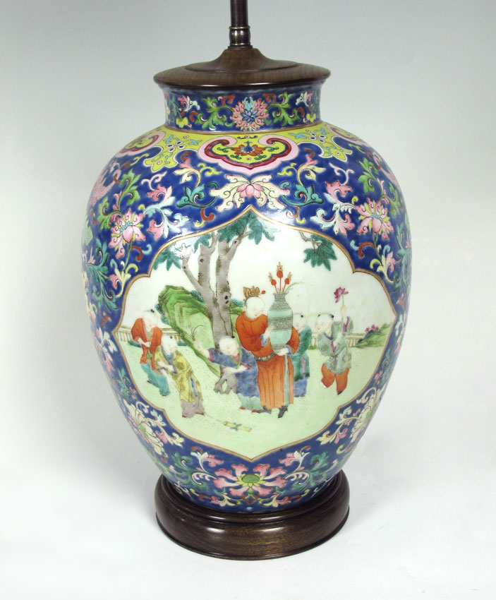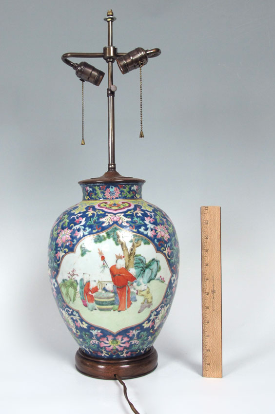 CHINESE POLYCHROME PORCELAIN TABLE LAMP: 27'' tall overall.