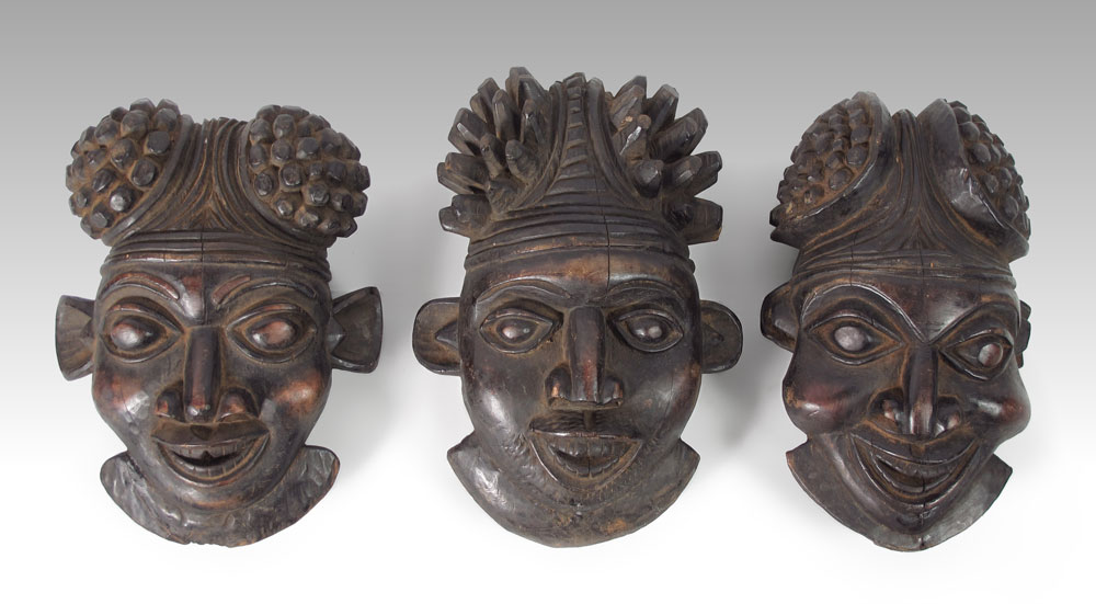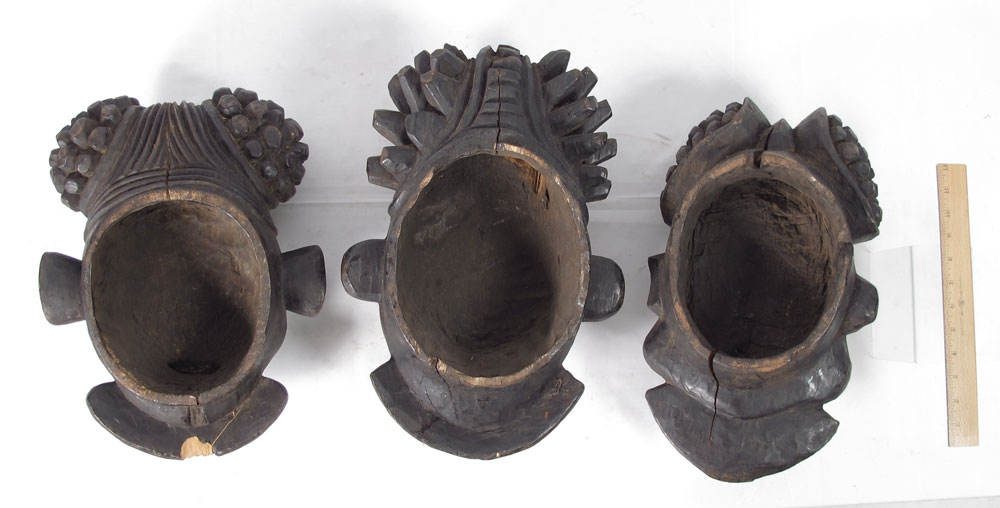 CARVED AFRICAN 3 BAMELEKE MASKS: 5 LBS., 6 LBS., & 4 1/2 LBS., 17'' x 12'' x 6'' & 18'' x 10 1/2'' x 7'' & 18'' x 12'' x 7''.