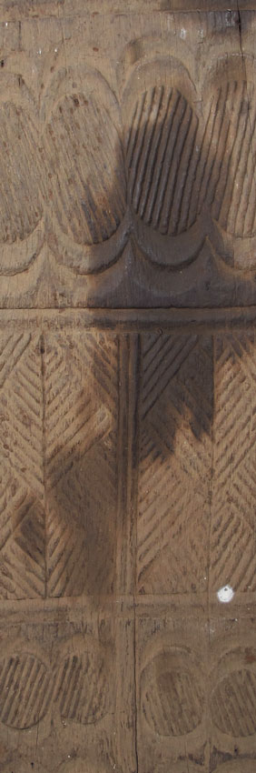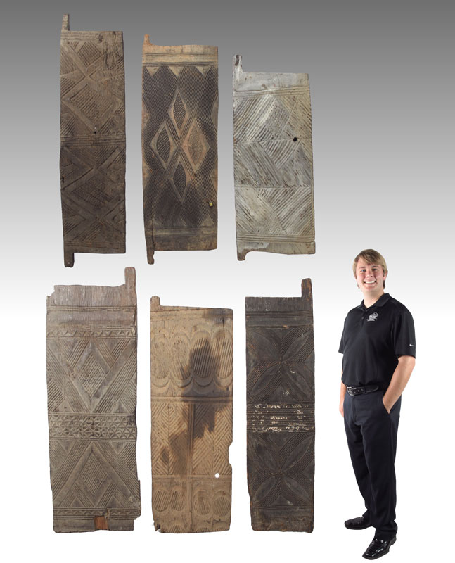 CARVED AFRICAN LOT OF 6 LARGE DOOR PANELS: 45 1/2 LBS., 68'' x 23 1/2'' x 1'', 43 LBS., 62'' x 21'' x 1'', 60'' x 20'' x 1 1/2'', and 65 1/2'' x 7'' x 1''.