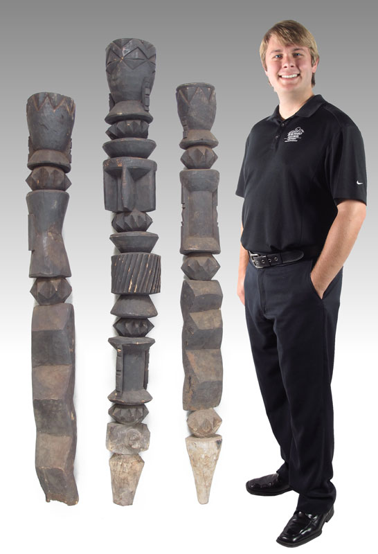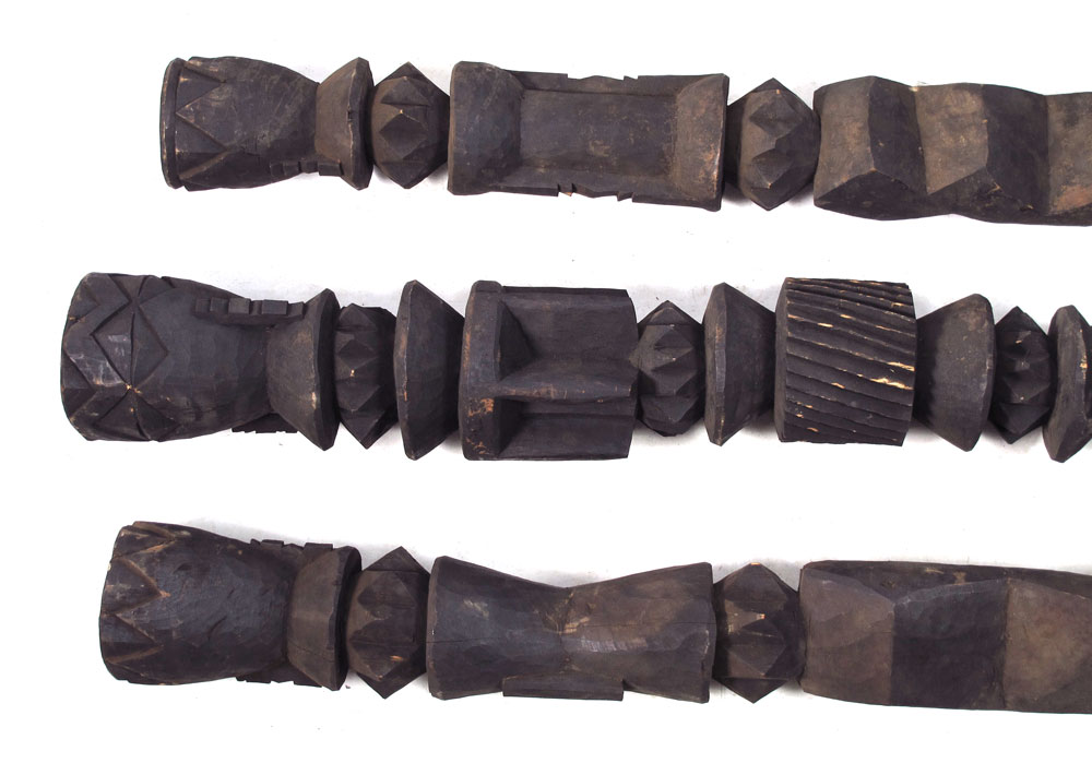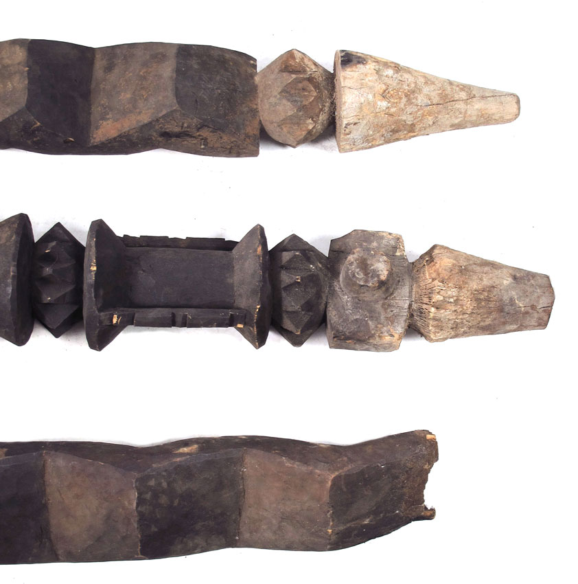 CARVED AFRICAN LOT OF 3 NUPE GEOMETRIC HOUSE POST: 72'' x 8'', 63 1/2'' x 6 1/2'', and 67 1/2'' x 6 1/2''.