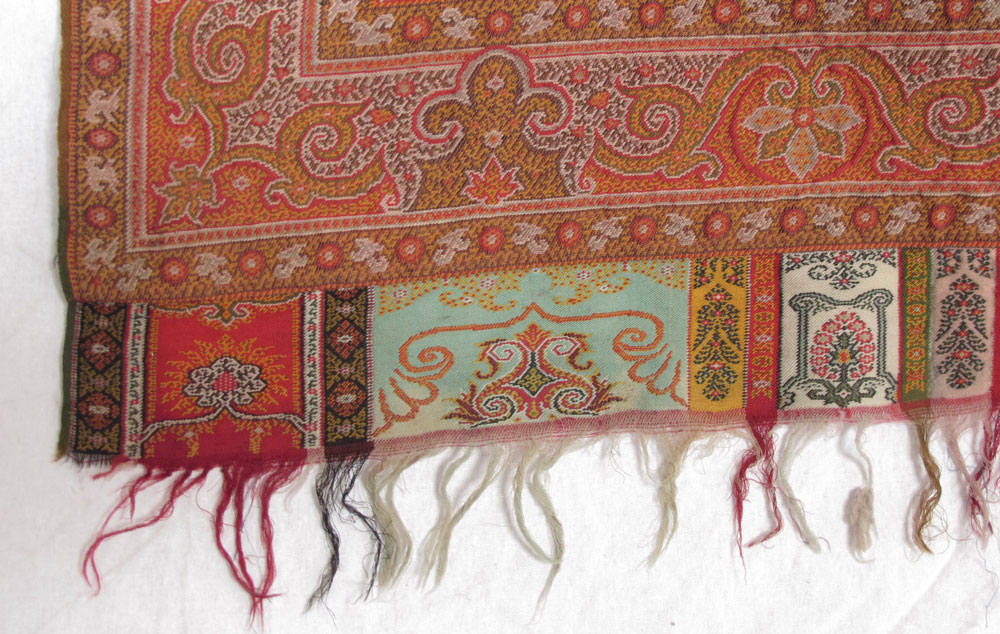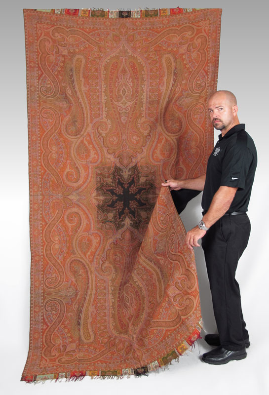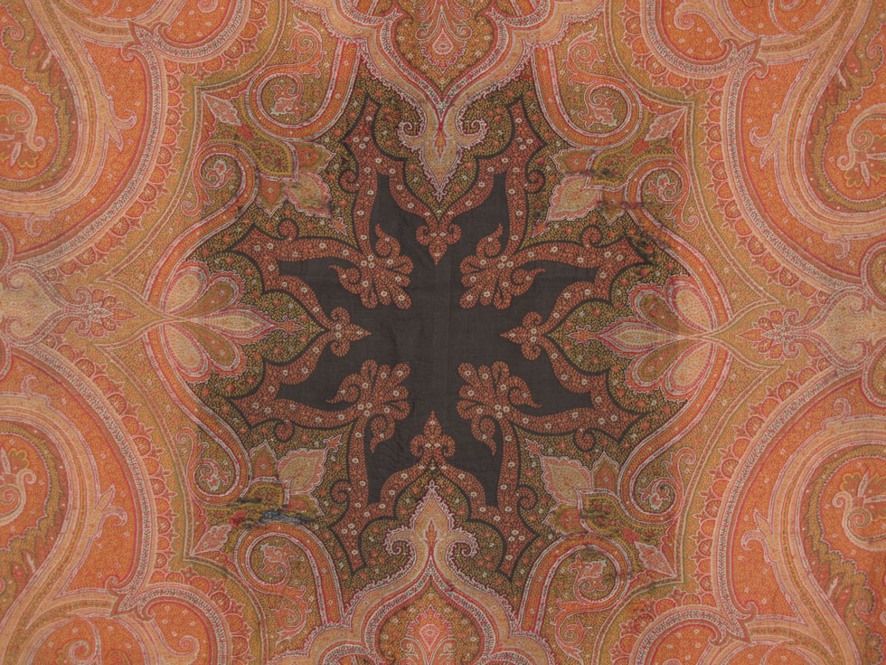 LATE NINETEENTH CENTURY MACHINE LOOMED PAISLEY SHAWL, 5' x 9'8'': This large Paisley or piano shawl's design came from hand woven shawls made in India that were worn for warmth and status by men. The name Paisley comes from the town in Scotland where machine loomed versions of the shawls were made. These were worn in England and the U.S. by women or were draped over the family piano in the home. The design of the shawl is a traditional elongated large paisley, or boteh design around a small black center. The side end borders are composed of small colorful panels of patterns that are different than the field. This shawl has been backed with black material.