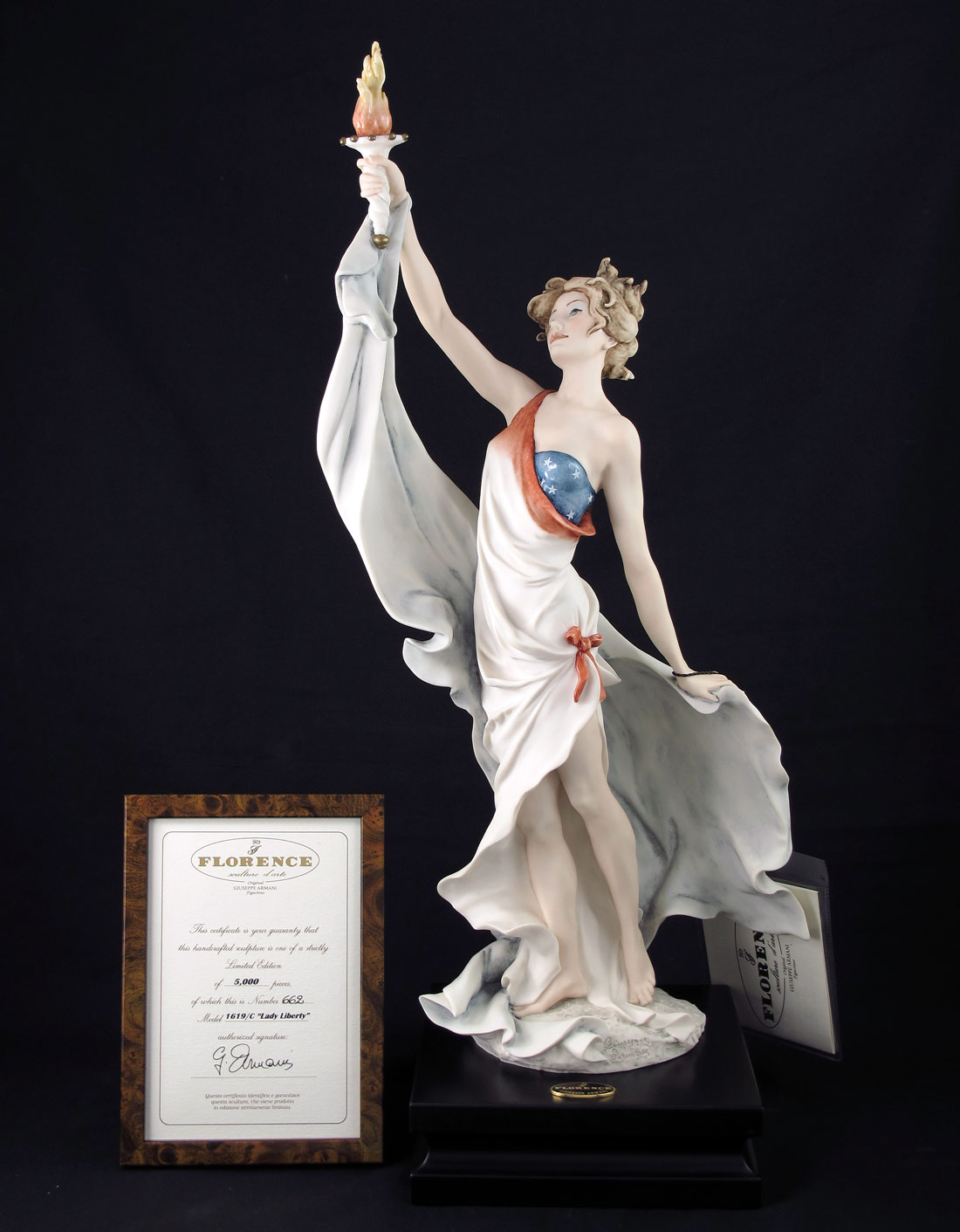 GIUSEPPE ARMANI LIMITED EDITION FIGURINE LADY LIBERTY: 1619 C, 2001, #662/5000, ''Florence sculture d'arte'' Made in Italy, 21''h. with box 10'' x 12'' x 26'', tag and coa.