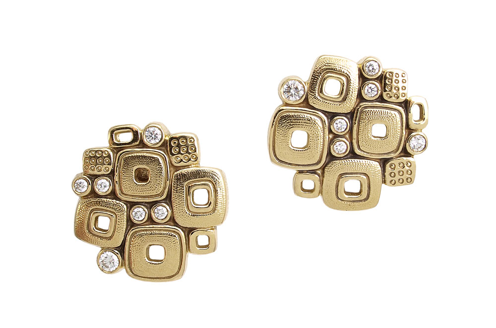 ALEX SEPKUS ''LITTLE WINDOWS'' 18K GOLD & DIAMOND EARRINGS: 18K yellow gold Little Windows accented by 12 diamonds totaling approx. .18 Ct. Diamonds are bezel set. Post and hinge Omega. Diam. .5'' Weight: 6.8 grams. Signed Alex Sepkus. Sold with current Atlanta Gemological GIA graduates appraisal for $1,350. Retails for approx. $3000.