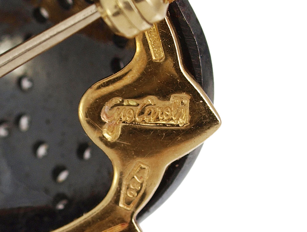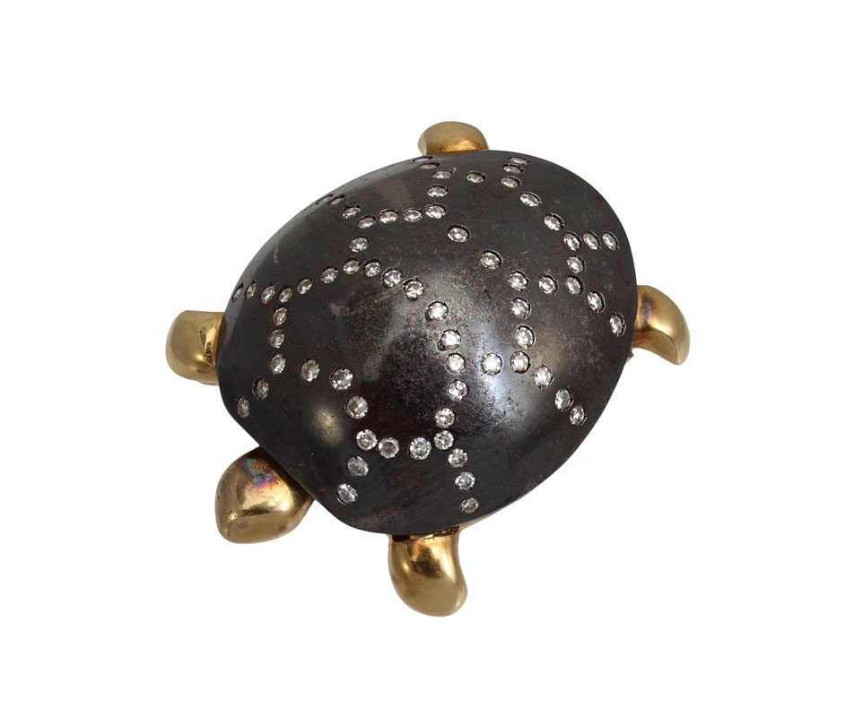 GIO CAROLI DIAMOND SET 18K & OXODIZED METAL TURTLE BROOCH: Italian designer Gio Caroli, known for his designs in the 1960's and 70's. 18K yellow and oxidized metal figural brooch set with 66 round single cut diamonds all totaling approx. .50 Ct. Rated VS in clarity and G-H in color. The diamonds are knife set. Length 1.25''. Weight: 11.8 grams Bar pin closure. Signed: Gio Caroli.