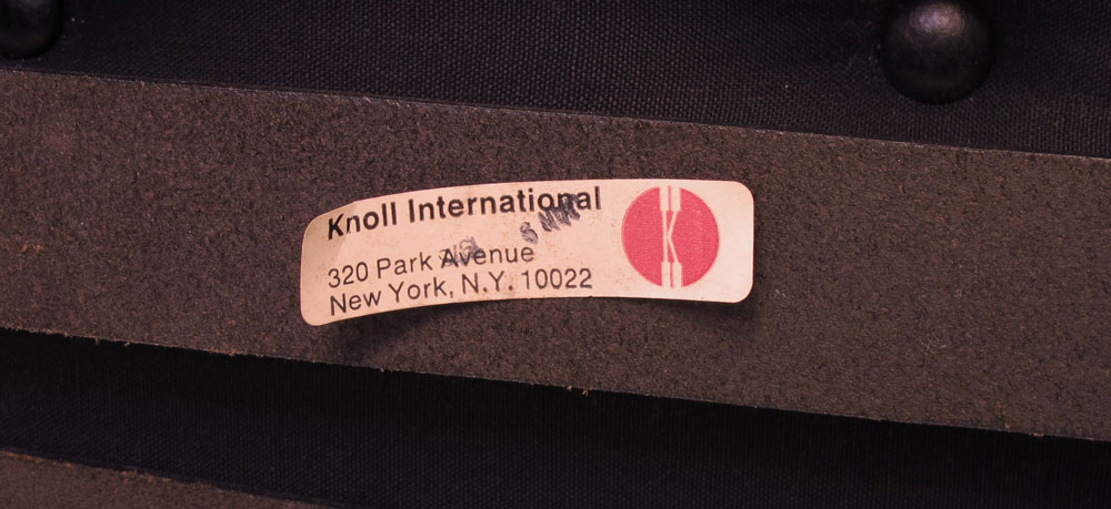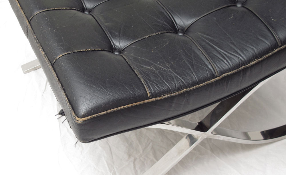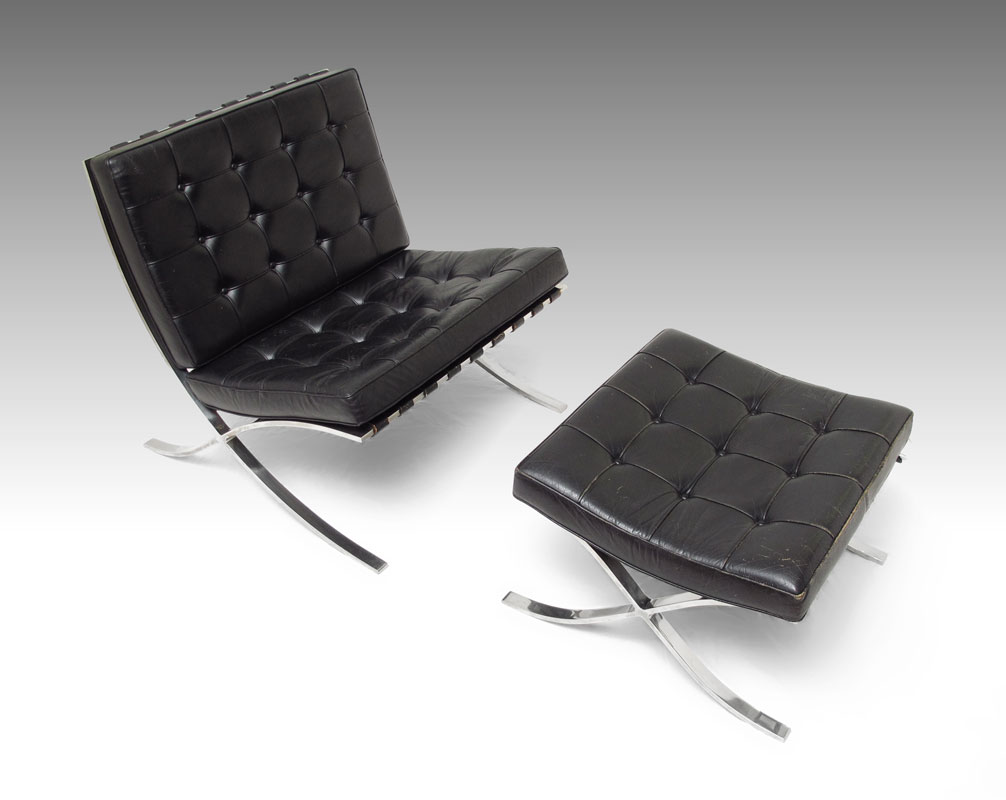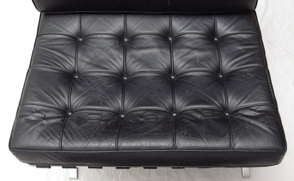 KNOLL MIES VAN der ROHE DESIGNED BARCELONA CHAIR AND OTTOMAN: Button tufted black leather on chrome. Button tufted black leather on chrome. This is an older chair and the leather does show signs of gentle use. 28''tall, 29 1/2''w. The ottoman measures 19''h. x 22'' x 23.5''. Knoll label on the chair. For a matched pair see next lot, #64.