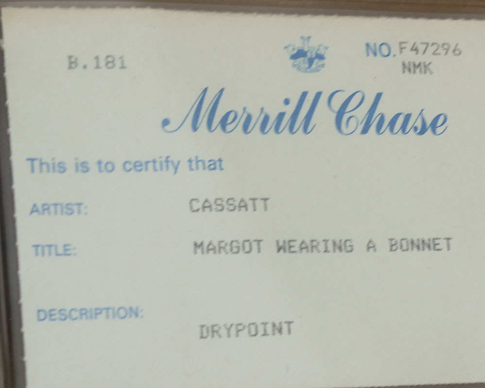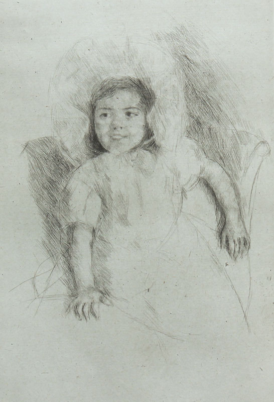 CASSATT, Mary Stevenson, (American 1844-1926): Etching, sight size, 10'' x 7 1/2'', framed 22'' x 18 1/2'', Merrill Chase Gallery COA affixed verso.