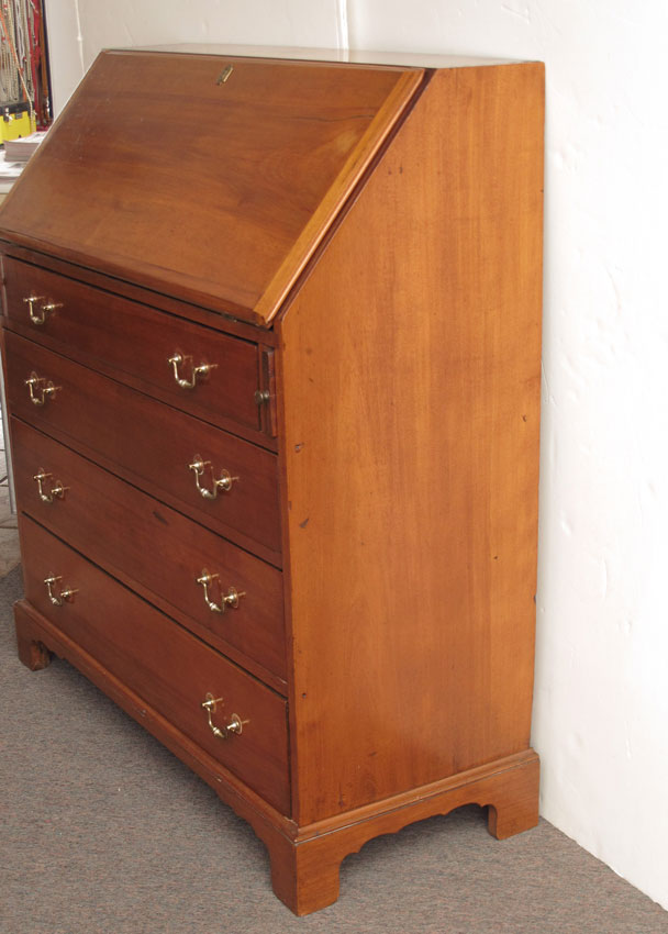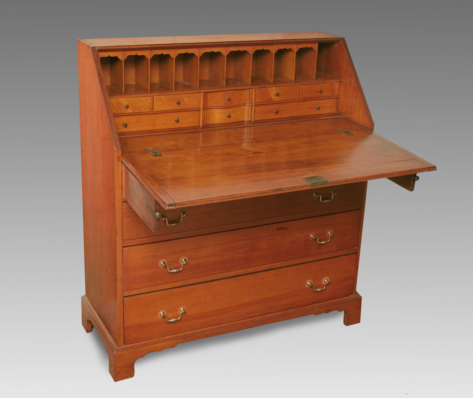 CHIPPENDALE STYLE CHERRY SLANT FRONT SECRETARY: 19th century, interior top with 10 valenced pigeon holes, 8 drawers with 2 central drawer having shaped fronts. Over 4 graduated full length drawers, on shaped front feet. Descended through the Howard Frankland family. 44 1/2'' h. x 39 3/4'' x 17''.