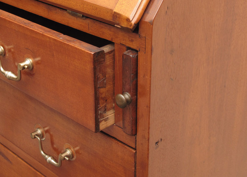 CONDITION: Missing one valance interior, age split to slant front, other wear consistent with age and use.