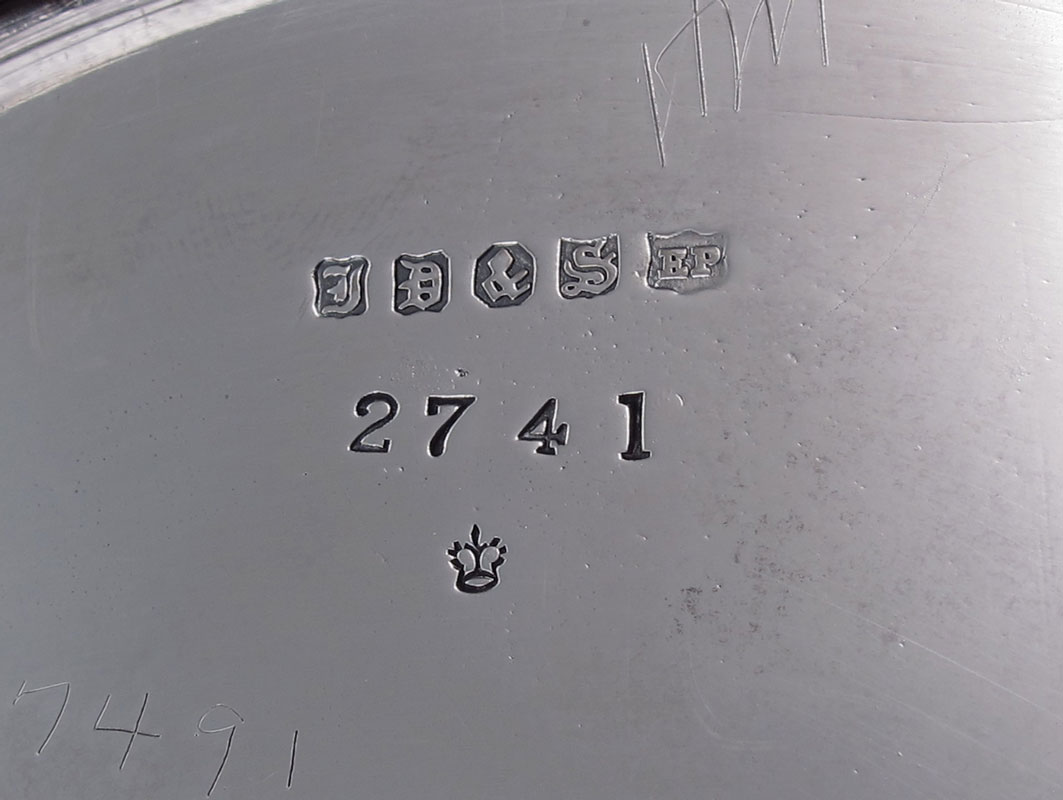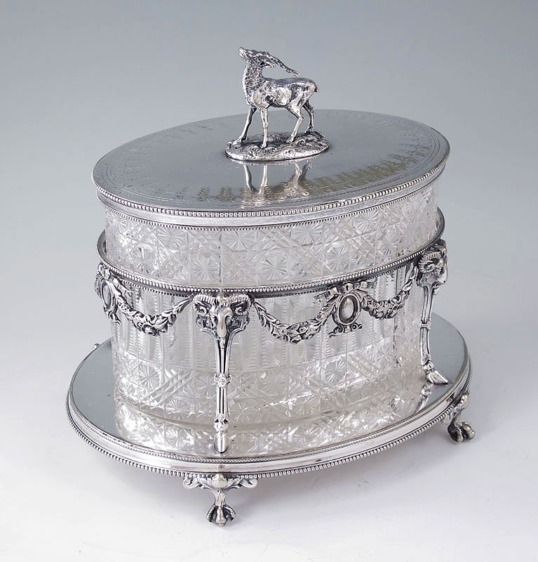 JAMES DIXON & SONS SILVERPLATE AND CUT GLASS BISCUIT JAR: English biscuit jar hallmarked James Dixon & Sons, EP. Stag finial on engraved lid to cut glass body. Garland supports with figural ram's head masquerons ending in hoof feet. Attached to base with 4 ball and claw feet. Measures 8 1/2'' h. x 9'' x 7''.