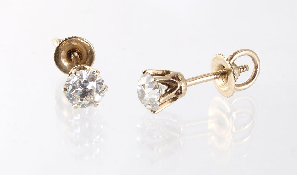 DIAMOND STUD EARRINGS: 14K earrings with Old European round cut diamonds. Total diamond weight: .81 Ct. Averaging VS1-VS2 in clarity and I-J color. Prong set. Threaded post and nut closures. Original violet velvet presentation box from JE Field, Milwaukee. Weight: 1.1 grams. Sold with current Atlanta Gemological GIA graduates appraisal for $2850.