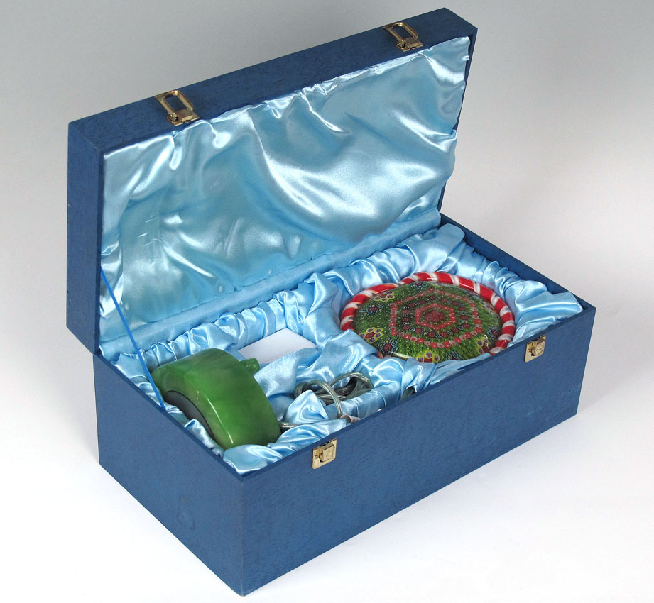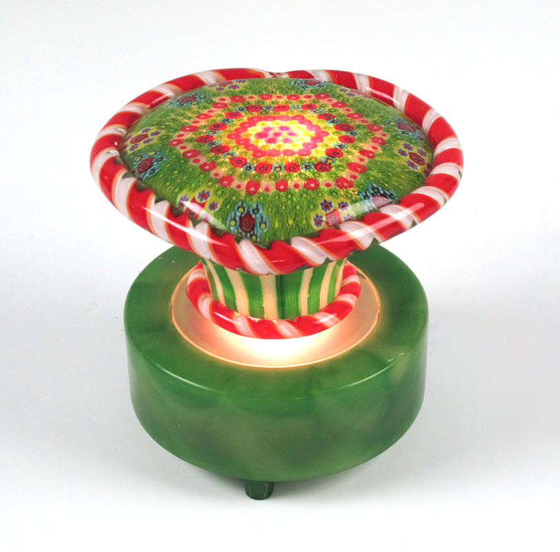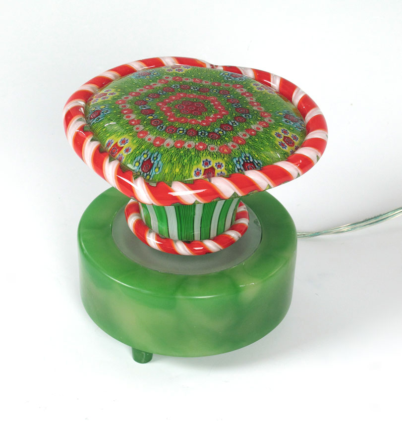 MURANO MILLEFIORI TABLE LAMP WITH ORIGINAL BOX: Heart shape top with red and white twist rim, sits on lighted base. Overall measures 7'' h. x 7 1/4'' x 7''. Sold with original presentation box, 7 1/2'' x 18'' x 9 3/4''.
