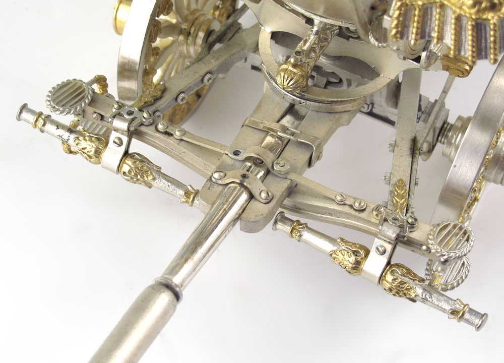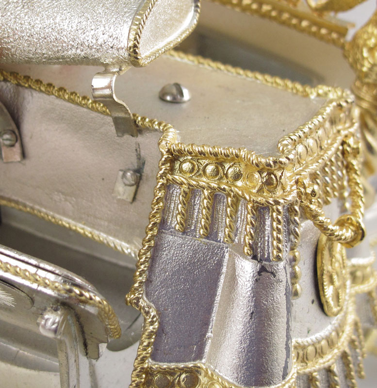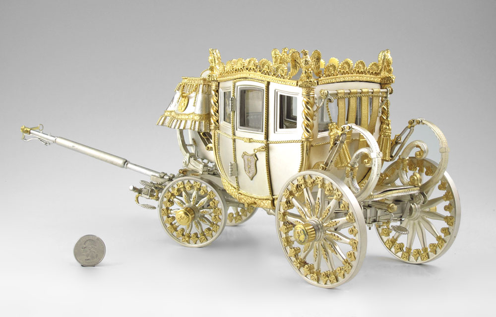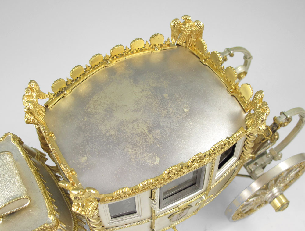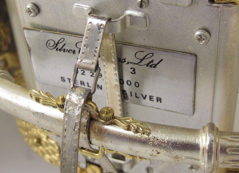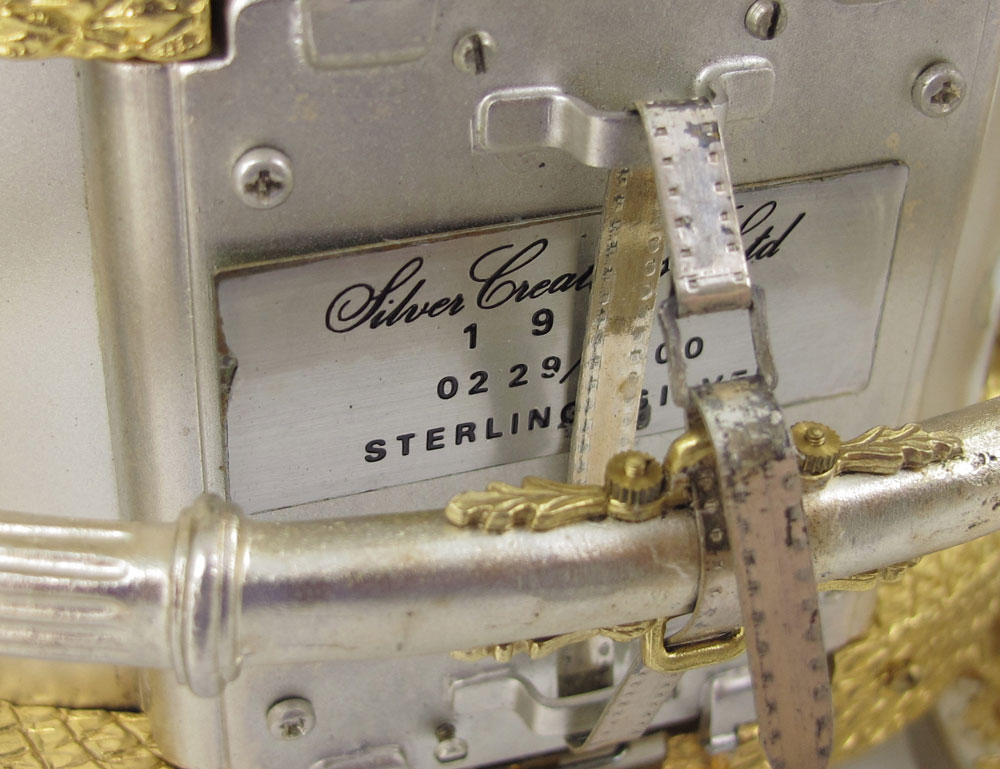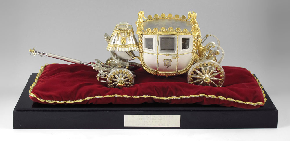 FISHER BODIES STERLING & GILT COACH: Sterling silver and gilt coach designed by Silver Creations Ltd for Fisher Bodies to celebrate its 50th anniversary. Many articulated pieces including wheels, doors, folding stairs and more. These coaches were designed for and made available to General Motors dealers for $2000. Marked Silver Creations Ltd., 1973, 0229/1000. Measures 6 1/4'' h. x 16 1/2'' x 5 1/2''. Sold with red velvet pillow on stand, stand has plaque including owner's name, overall measures 2 3/4'' x 21 1/2'' x 9''. Approx. 99.7 troy oz.