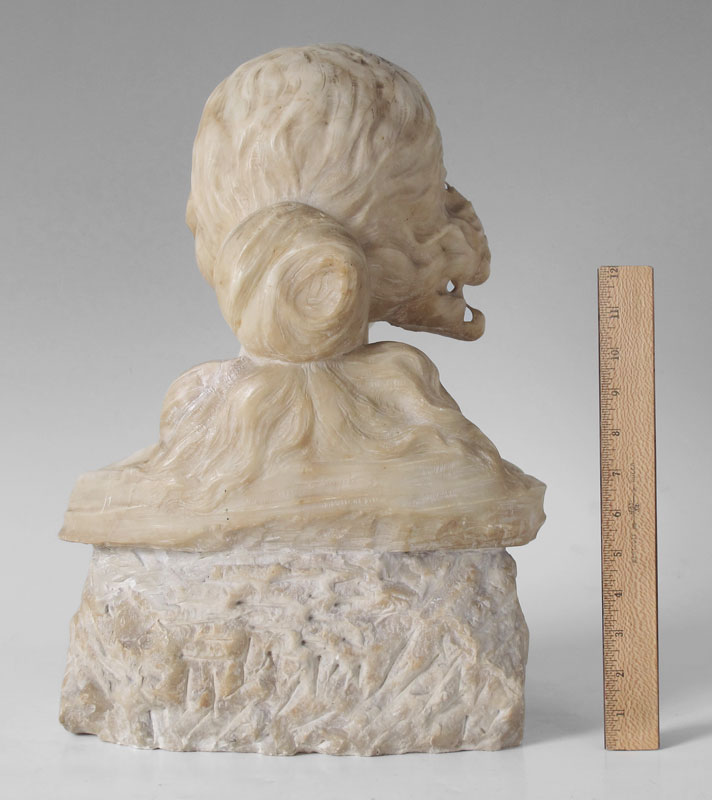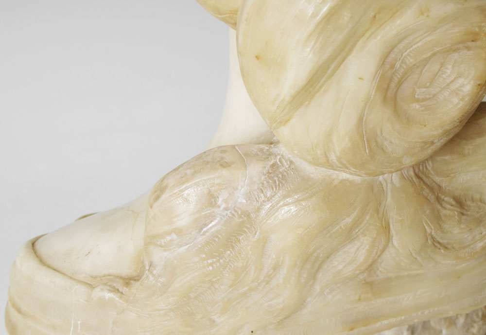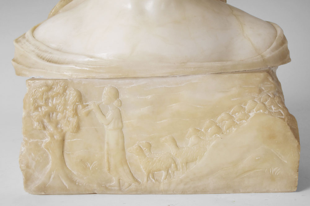 WONDERFULLY CARVED ALABASTER MAIDEN NOUVEAU SCULPTURE, 17'' h., 12'' w., 7'' d., affixed to a matching base with a relief carved scene of a young maiden with her flutes leading a flock of sheep; 1st quarter 20th C.